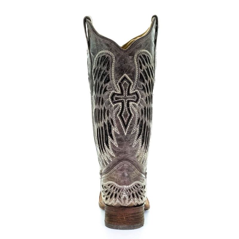 Ladies Brown/Black Wing & Cross -The A1197 is one of Corral's most iconic designs. A crater leather overlay reveals just a pop of sparkle and embroidery for the perfect classic combination.