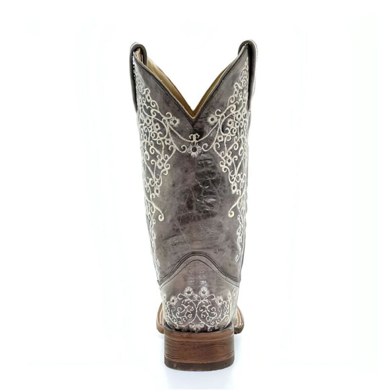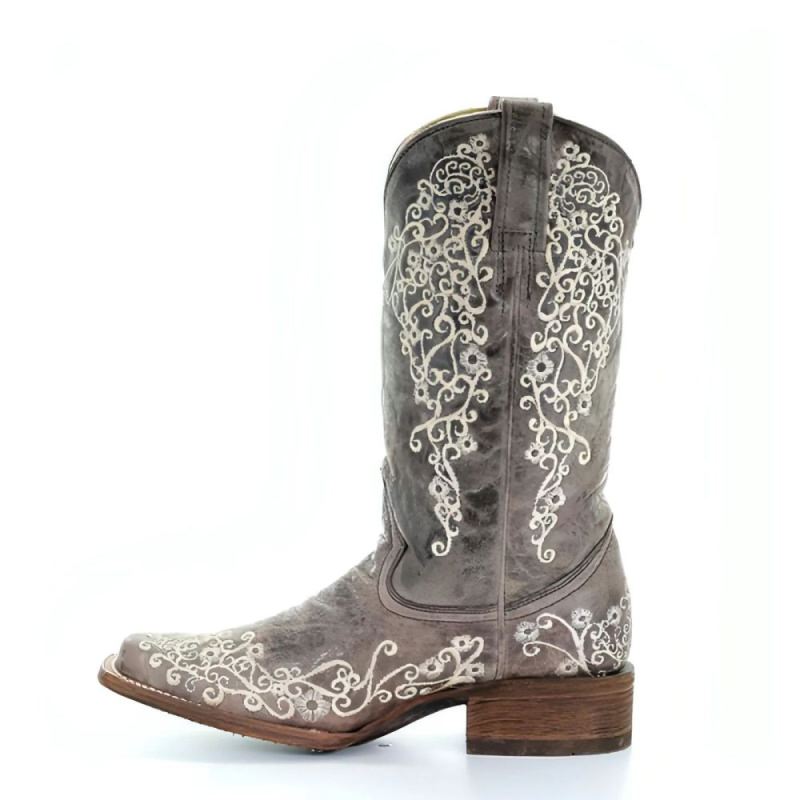 Ladies Brown Crater Bone Embroidery Sq. Toe - One of our most popular square toe boots features a gorgeous contrast between the delicacy of lace embroidery against the rustic leather. A classic for any occasion.