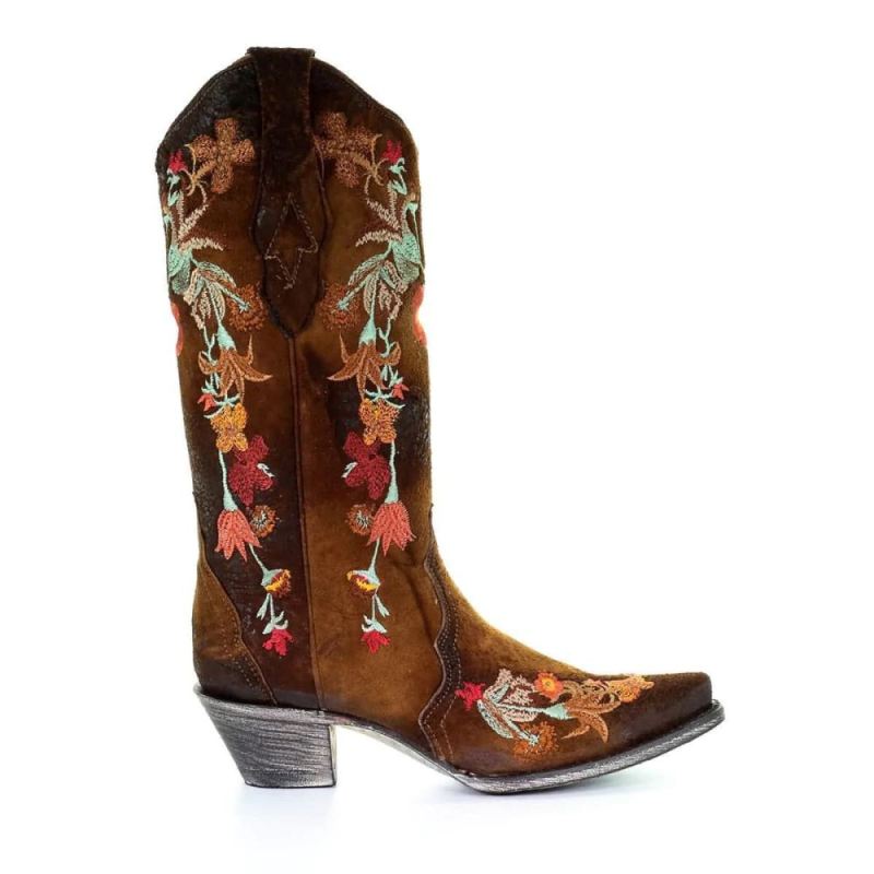 Ladies Chocolate Lamb Floral Embroidery -A rustic blend of floral embroidery set over our suede like, tumbled lamb skin gives this boot the perfect balance of grit and beauty.