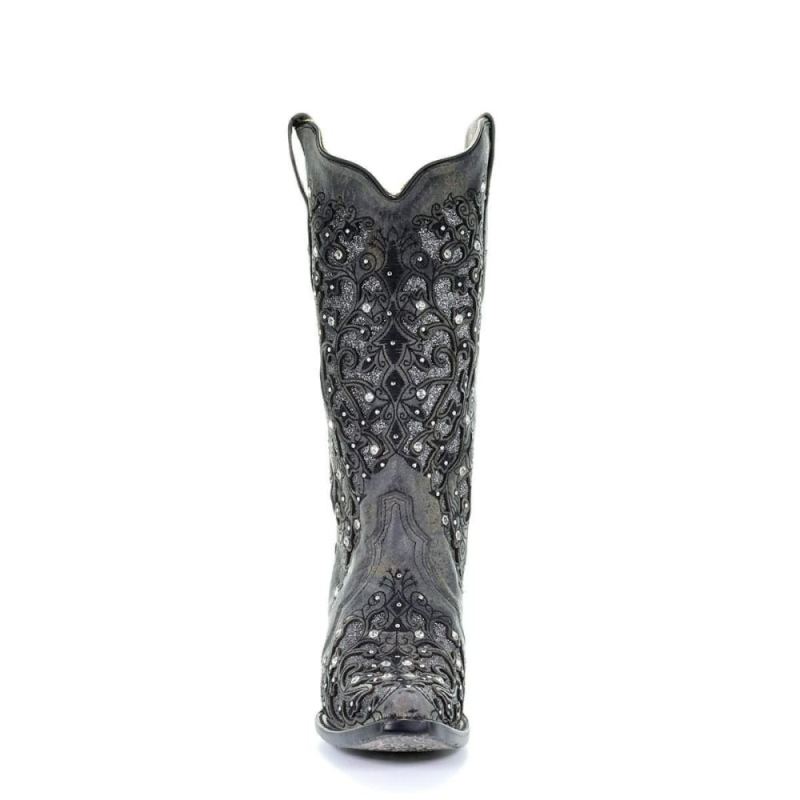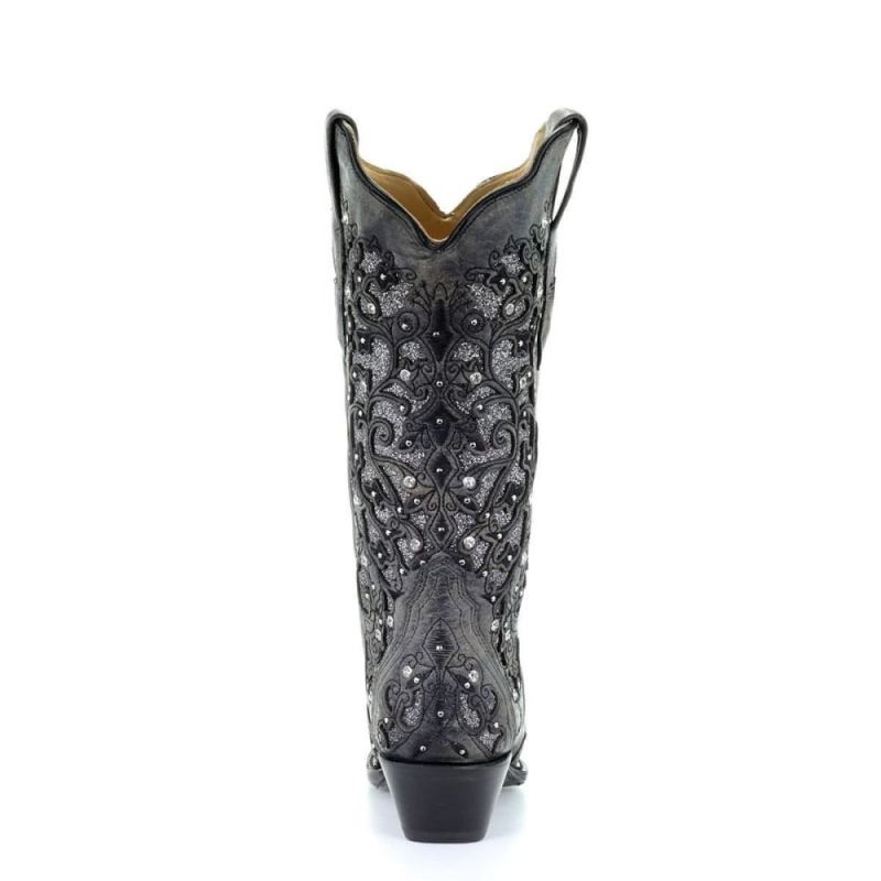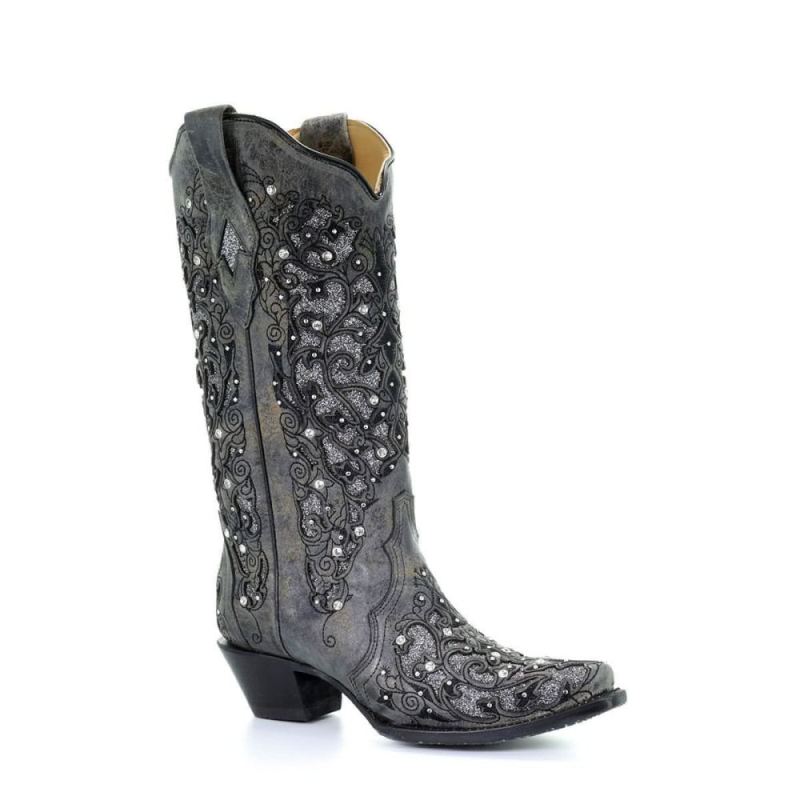 Grey Glitter Inlay and Crystals - Made with an original cowhide leather overlaying an iridescent glitter. This boot is finished with crystal accents making it perfect for your big day or any special event where you want to shine.