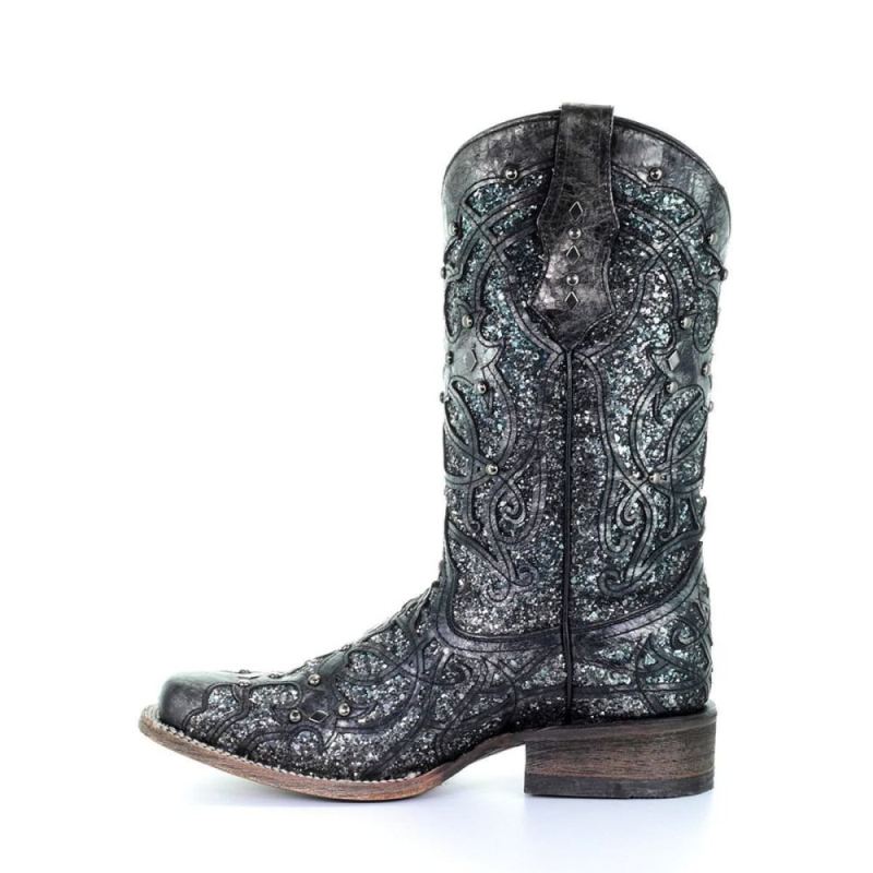 Ladies Black/Grey Glittered Inlay Sq. Toe - The C3404 is an original design featuring a finely cut black laser outline over a grey glitter inlay, adding just the right amount of sparkle and contrast.