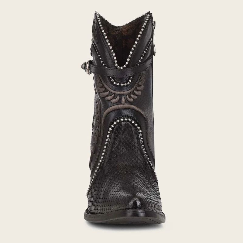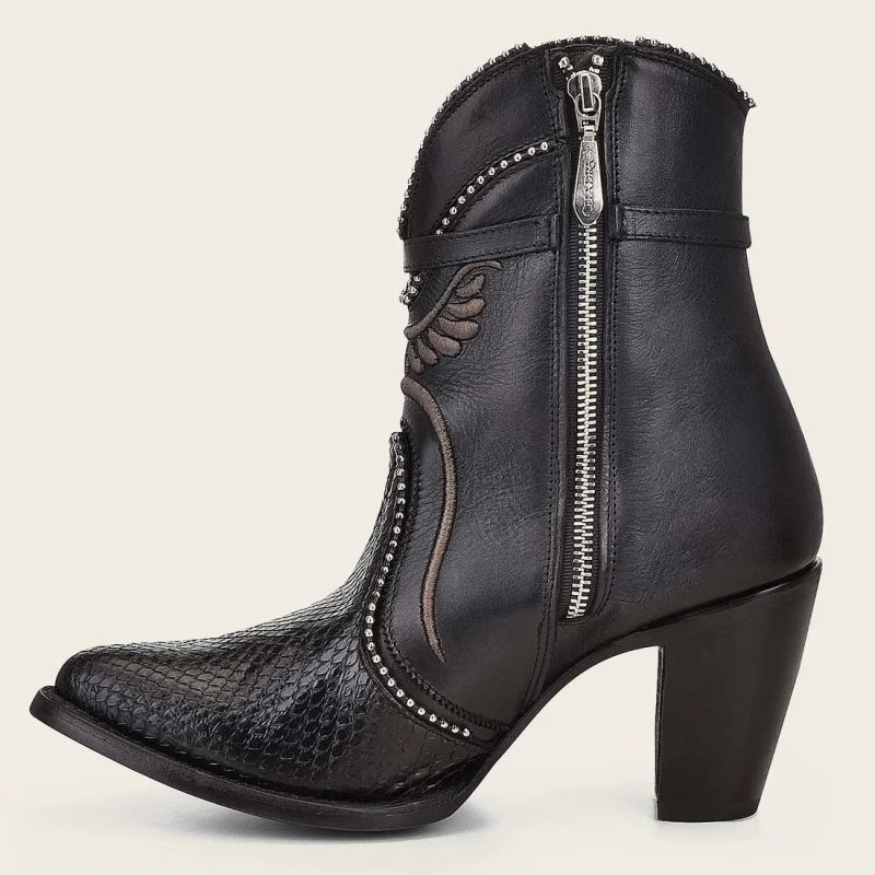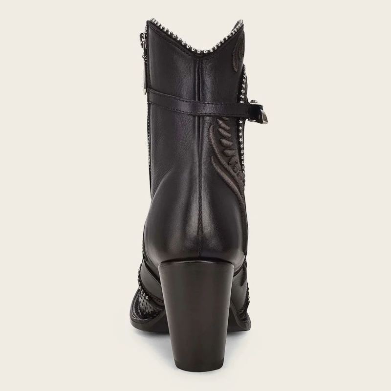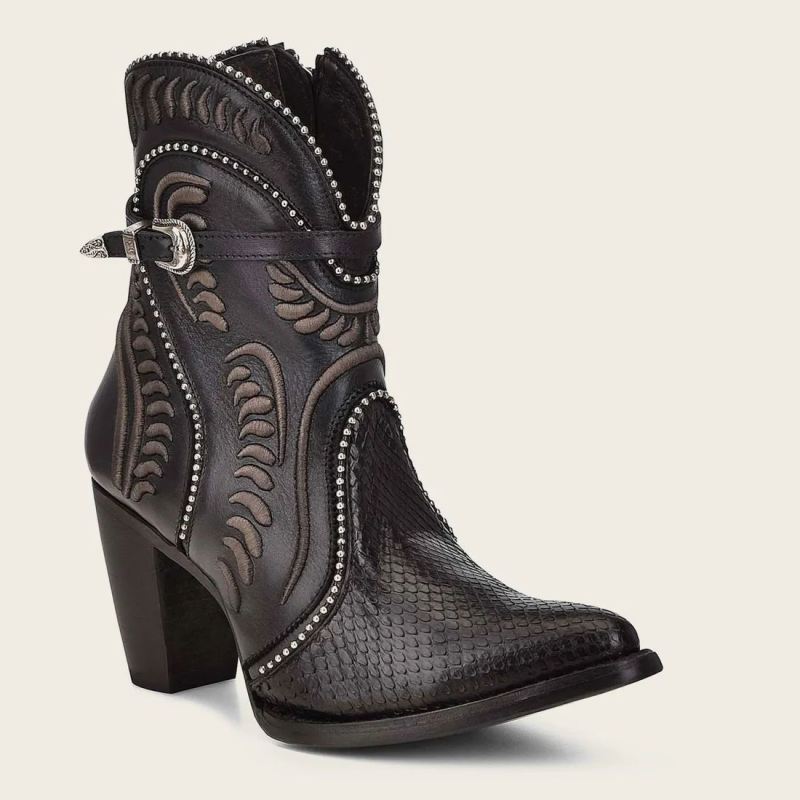 Step into sophistication with our exquisite women's genuine python embroidered black leather bootie.