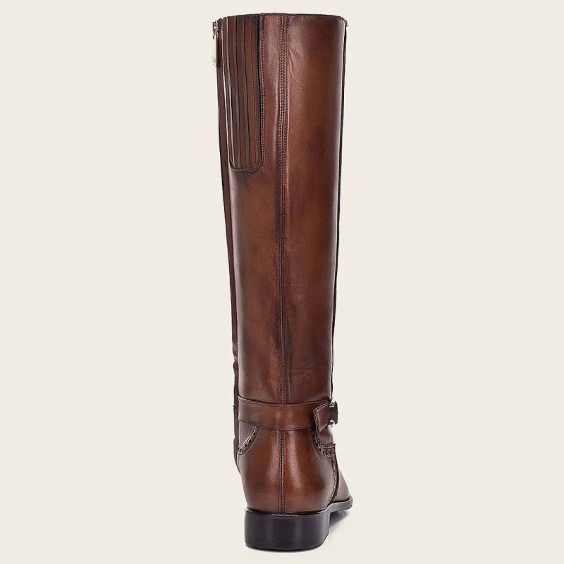 In summary, these riding style boots are a perfect combination of style and comfort. The hand-painted bovine leather is of the highest quality, and the fine broguing details and metallic buckle add a touch of elegance. With an inner zipper and a dual-density leather sole, these boots are designed to fit and feel great, no matter where your day takes you.