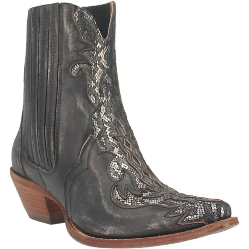 Cause a scene and become the talk of the town with the Dan Post Shay boot in black. This head-turning, 8-inch boot features a metallic inlay design, snip toe and medium cowboy heel.