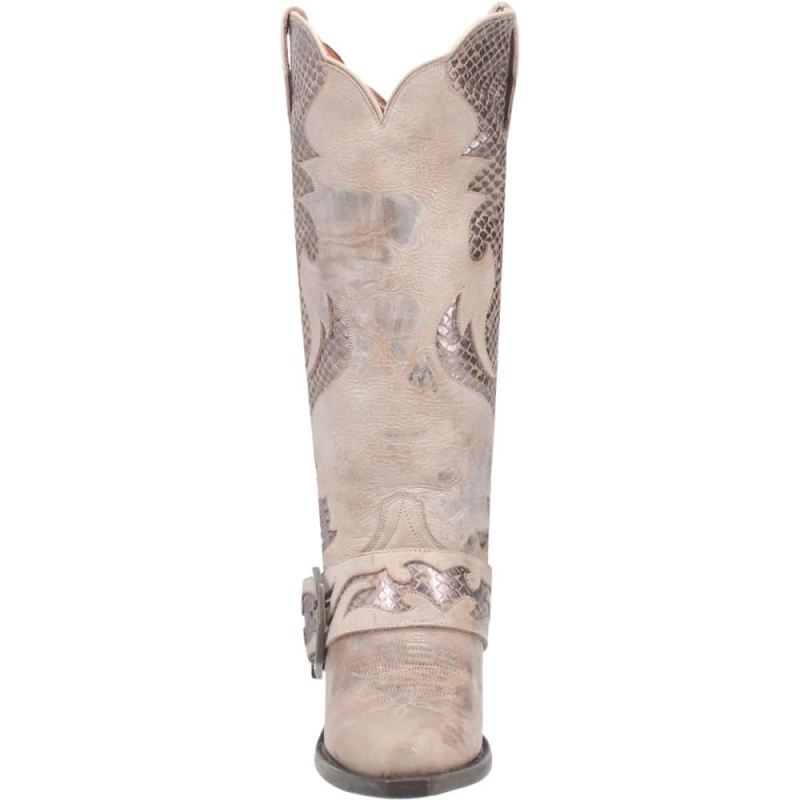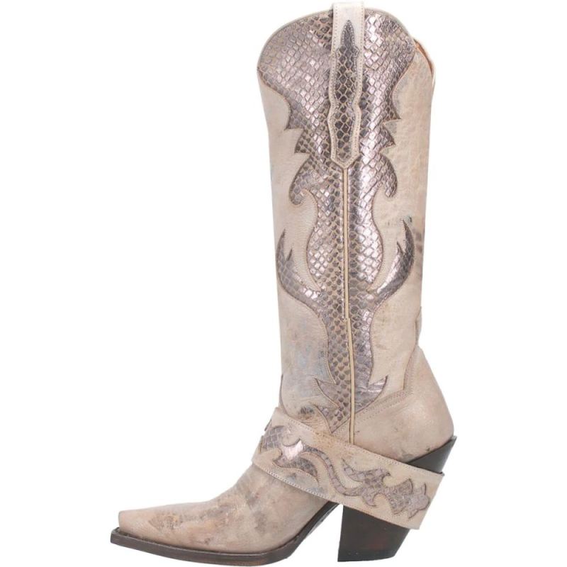 Add a dash of flash to any outfit with the Dan Post Sydney boot in off white. These 15-inch stunners come with an ankle harness, chic buckle and a metallic inlay design. The tall fashion heel and snip toe are sure to wow and make a statement anywhere you go.