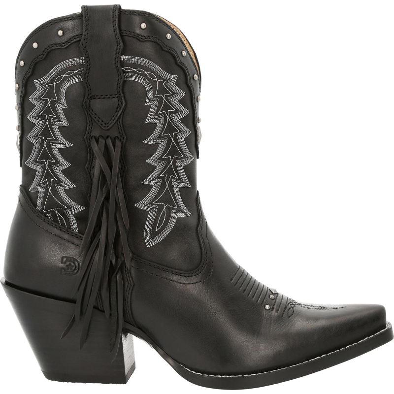 This style is full-grain leather with a faux shaft and beautiful fringe details. It has a soft mesh lining, antiqued silver studs and includes a medial side zipper for easy on/off and the Durango Sole Comfort Footbed.