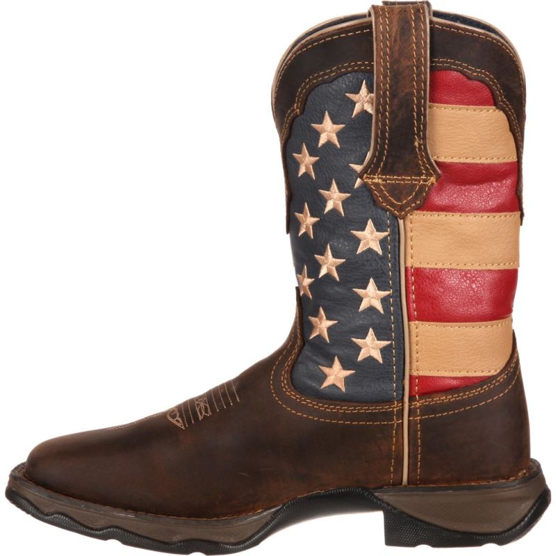 This Lady Rebel by Durango Western Boot will be the most attention-grabbing item in your closet. The stunning upper has the American flag on the shaft, full-grain brown leather that looks fashionably distressed, toe bug stitching and pull tabs that make it possible to get this pull-on boot on/off effortlessly.