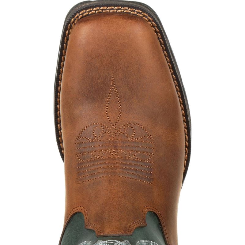 It has a contoured, ventilated, and removable cushion footbed with a cushion flex insole. This style also has a fiberglass shank for lightweight stability, rolled shank area, lightweight and flexible molded EVA midsole and a slip resistant, dual density and abrasion resistant rubber outsole. It has a double row sole stitch around the square toe for added durability with a 1 " rocker heel.