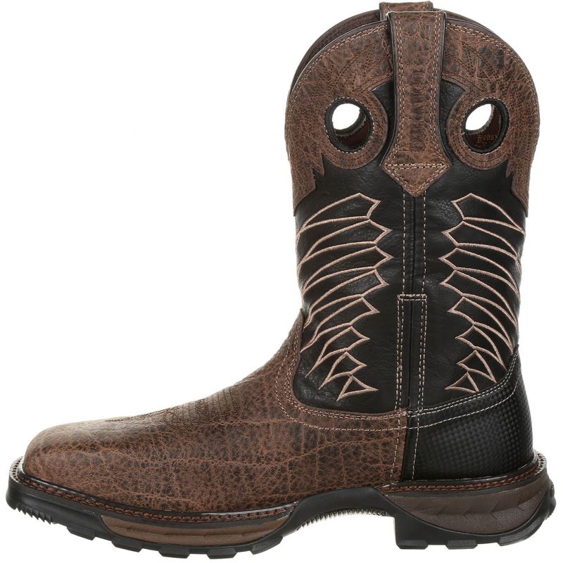 This is the men's 11" Western Waterproof Steel Toe Chocolate Safari Elephant/ Black Durango Maverick XP. This style is full-grain leather with a faux exotic elephant embossed vamp, collar and pull straps with a faux shaft. Inside it has a soft mesh lining and a Durango Waterproof membrane bootie to keep your feel dry all day long. It has the Durango X-Pand System which is a hidden gore expansion on the inside medial seam for a universal fit and easy on/off.