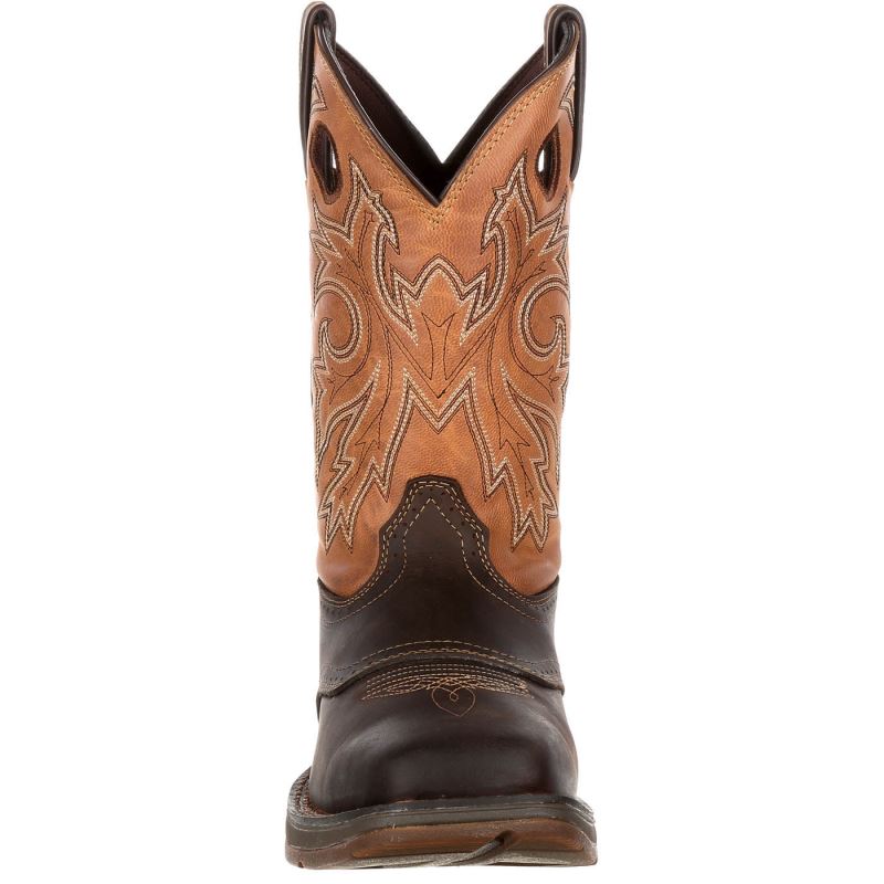 This men's 11" square-toe Western boot is part of the Rebel by Durango collection, so you can be certain that it will be lightweight, comfortable to wear and outstandingly durable. Its upper has been constructed out of full-grain leather; the slight distressing, handsome stitching and combination of burnt yellow and brown hues creates a very nice looking men's boot. Having finger holes, pull straps and a slightly dipped topline allow you to pull these Western boots on with absolute ease.