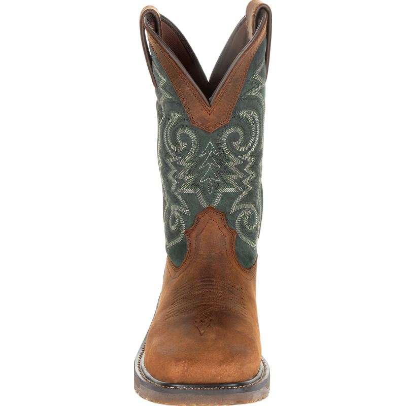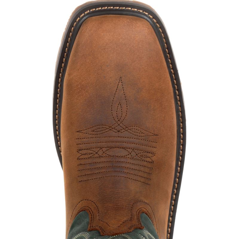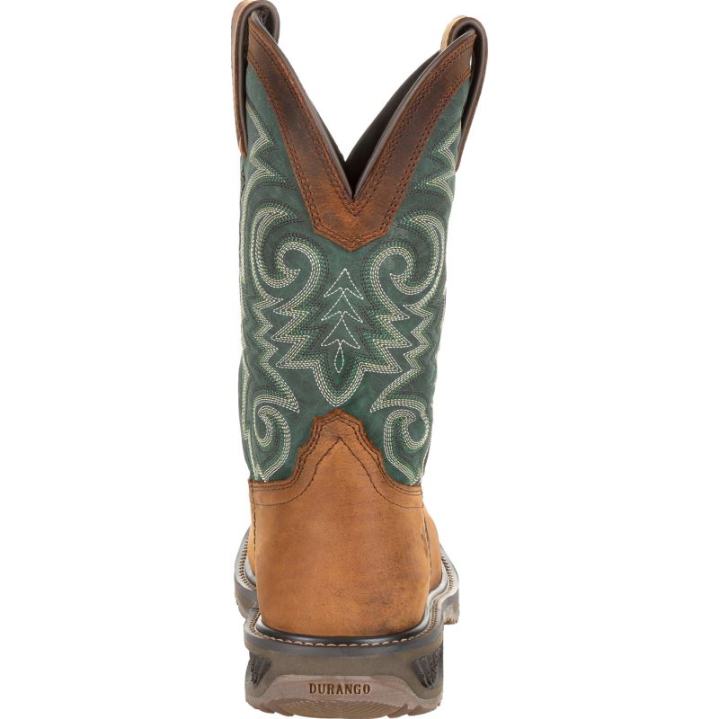This is the men's 11 inch Western Brown/Forest Green Steel Toe Durango WorkHorse. This style has a full-grain leather foot, collar and pull straps with a faux shaft, soft mesh lining and a breathable dual-density contoured cushioned footbed for all-day comfort. This style also features the Durango X-Pand System which is a hidden gore expansion on the inside medial seam for a universal fit and easy on/off.