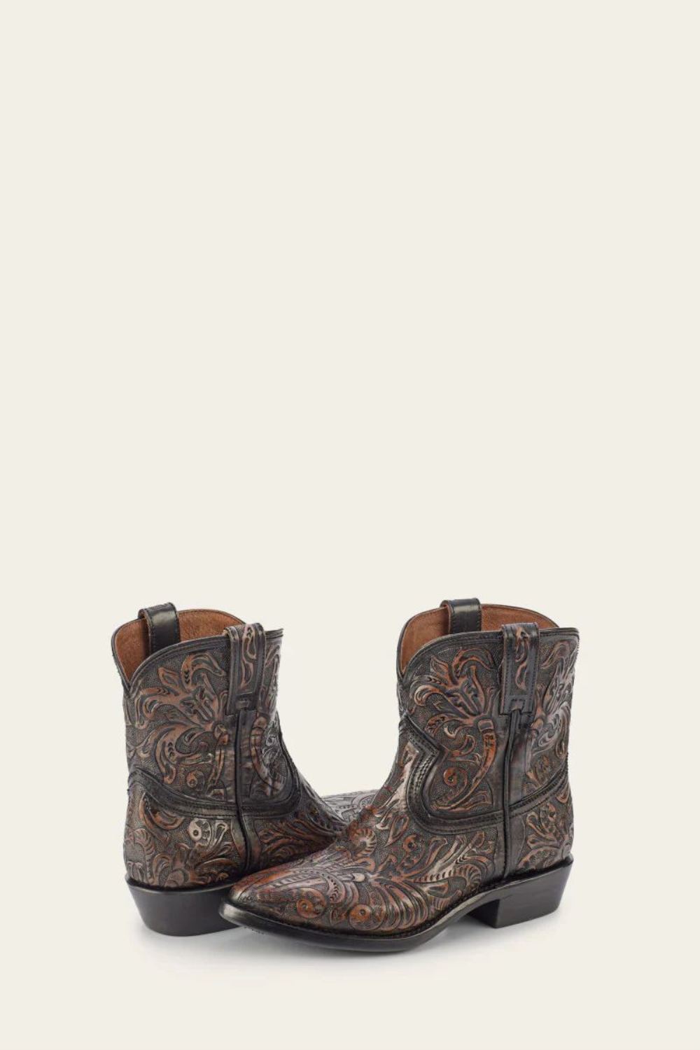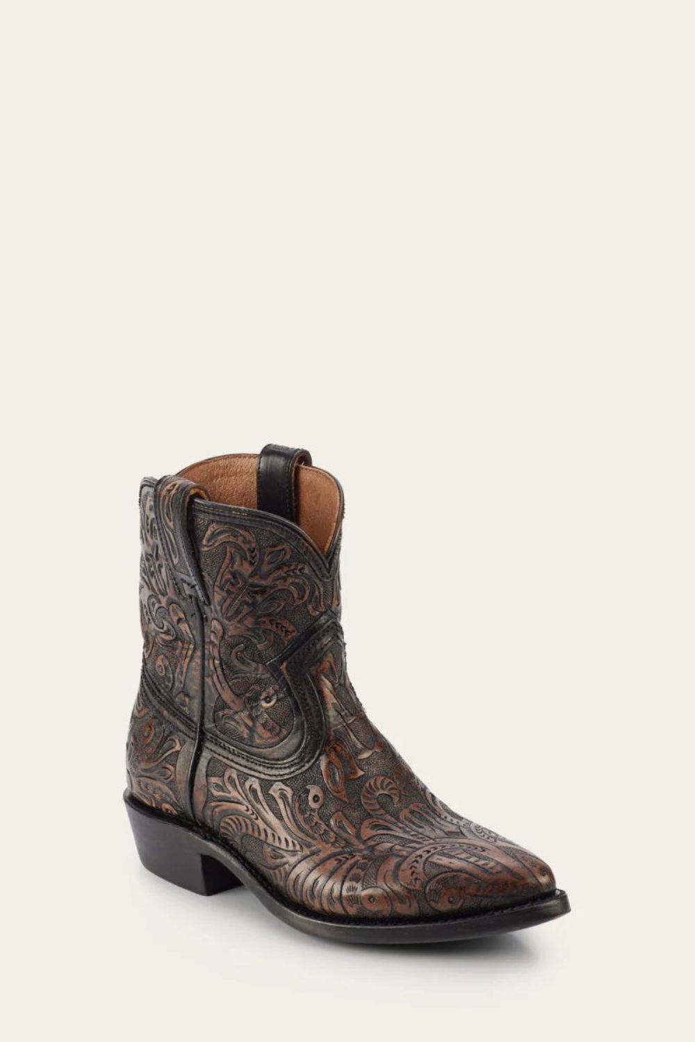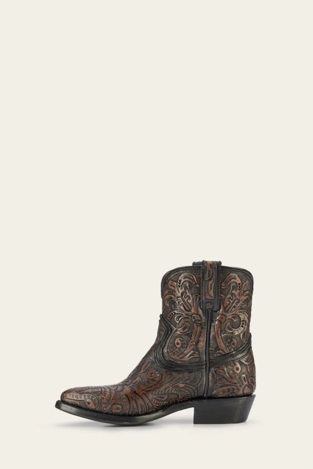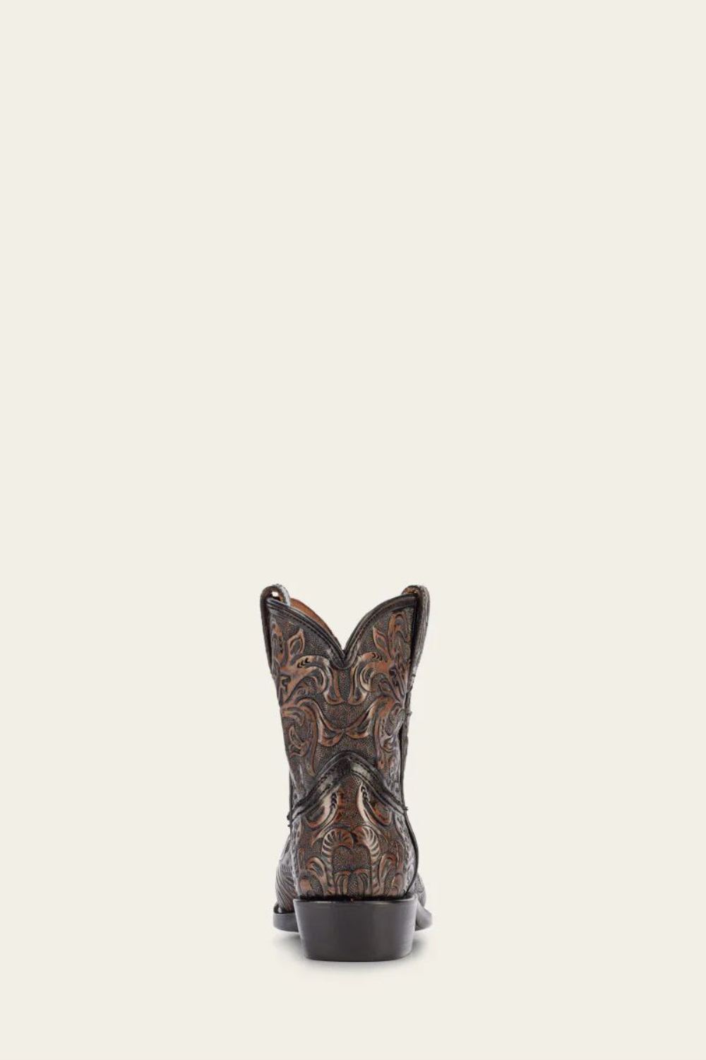 The short version of the Billy Daisy Pull-On Boot is made with the same exceptional craftsmanship. This modern Western boot is made with hand tooled leather for a one-of-a-kind design. The soft leather lining ensures a comfortable fit. A pointed toe and pull tabs complete the look.