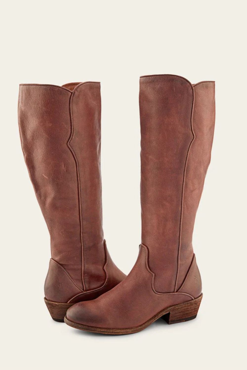 A Frye classic, the Carson Piping Tall Boot is made of sof,t textured leather uppers with Western piping detailing. Set on low heel with an inside zipper closure for easy entry, This pattern features both regular and wide width shafts to accomodate most customers.