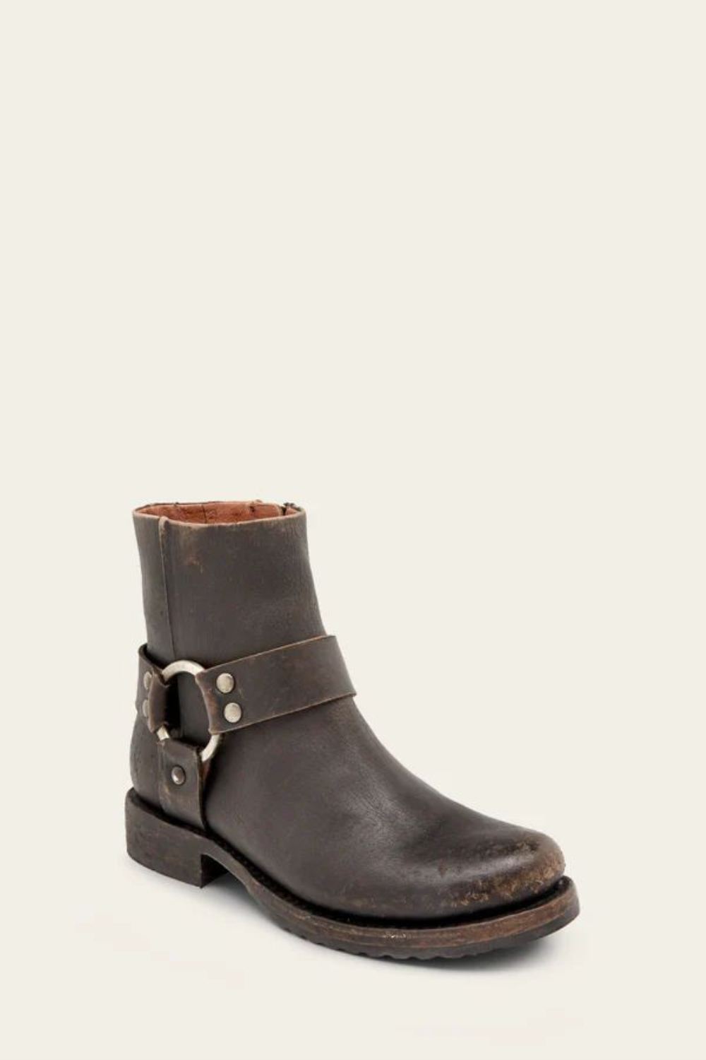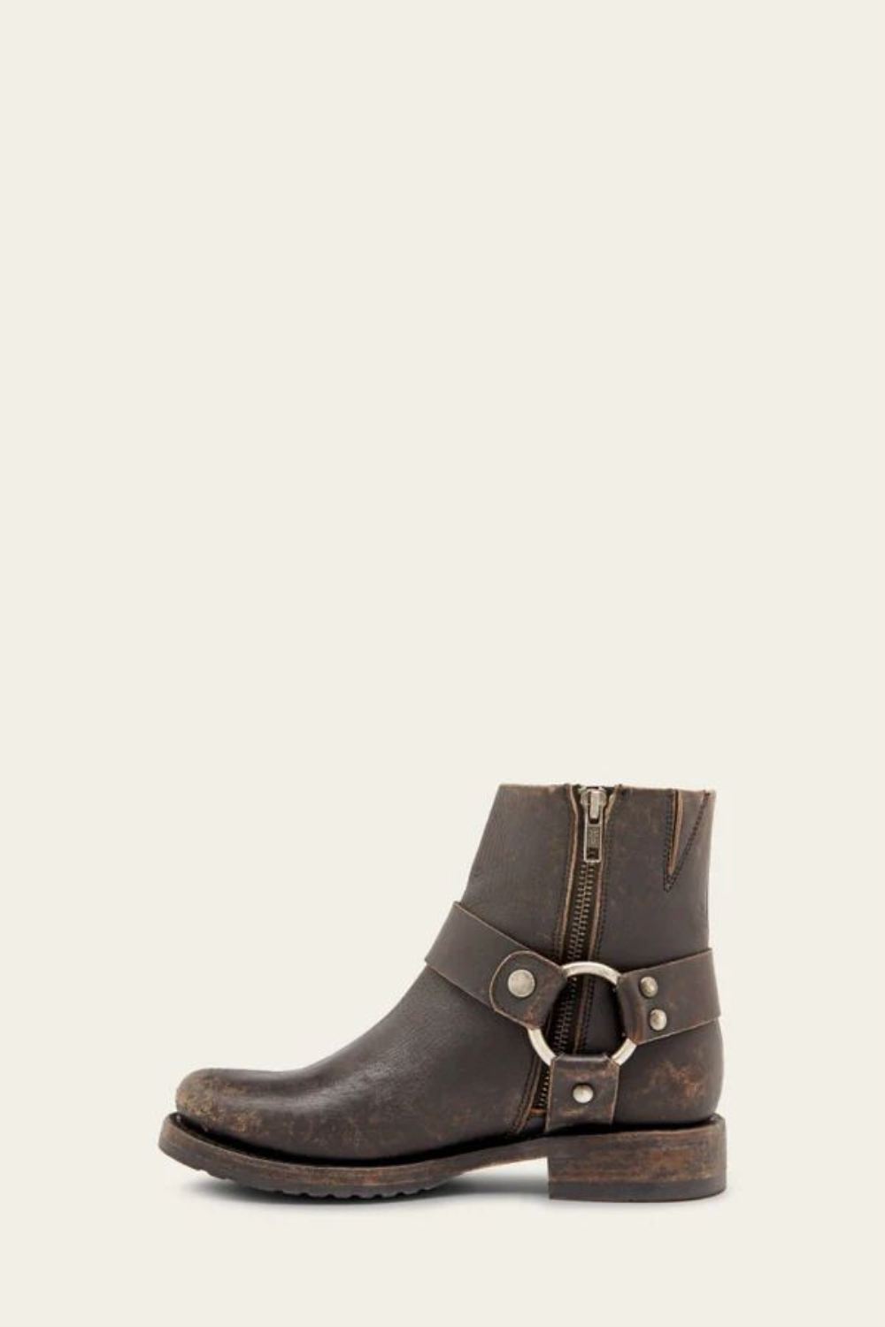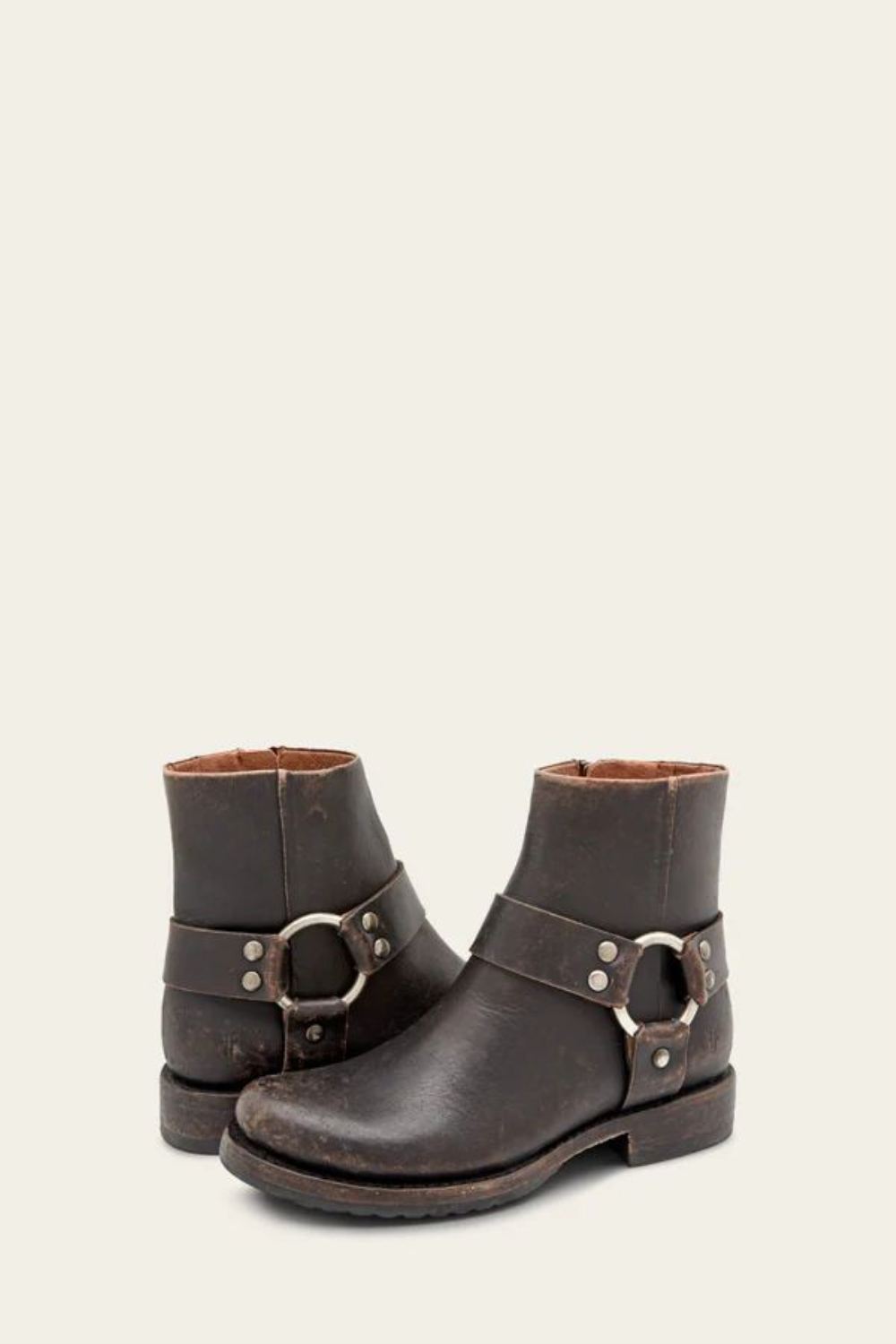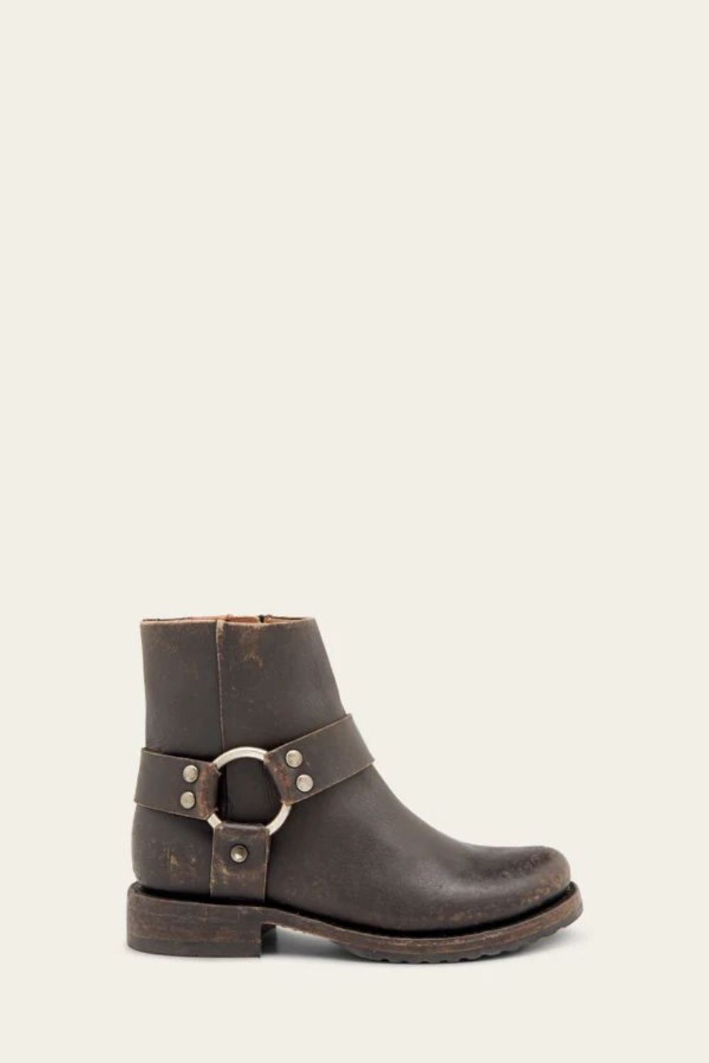 The classic and authentic Frye pattern, the Veronica Harness Short Boot features our signature harness that is both fashionable and functional with snaps for easy on-off wear. A rubber lug outsole offers traction and an inside zip adds to an easy entry.