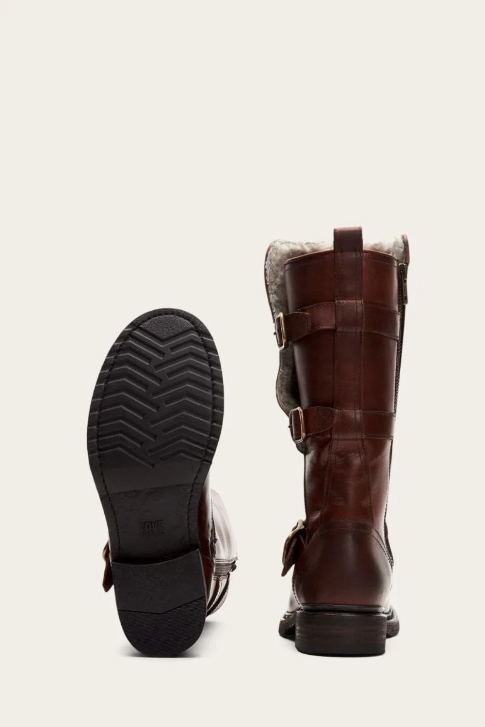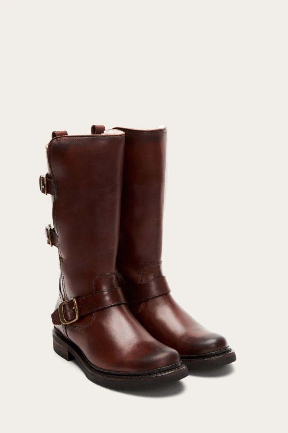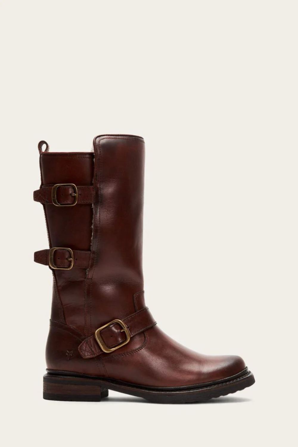 Who says warm winter boots can't be stylish The Veronica mid-height boot is designed to keep you feeling warm and looking cool all winter long. Crafted with weatherproofed vintage leather and a cozy shearling lining, this stylish pair was built for the outdoors. This boot features chunky soles with plenty of traction and is detailed with classic moto buckle hardware and an inside zipper closure for an edgy look.