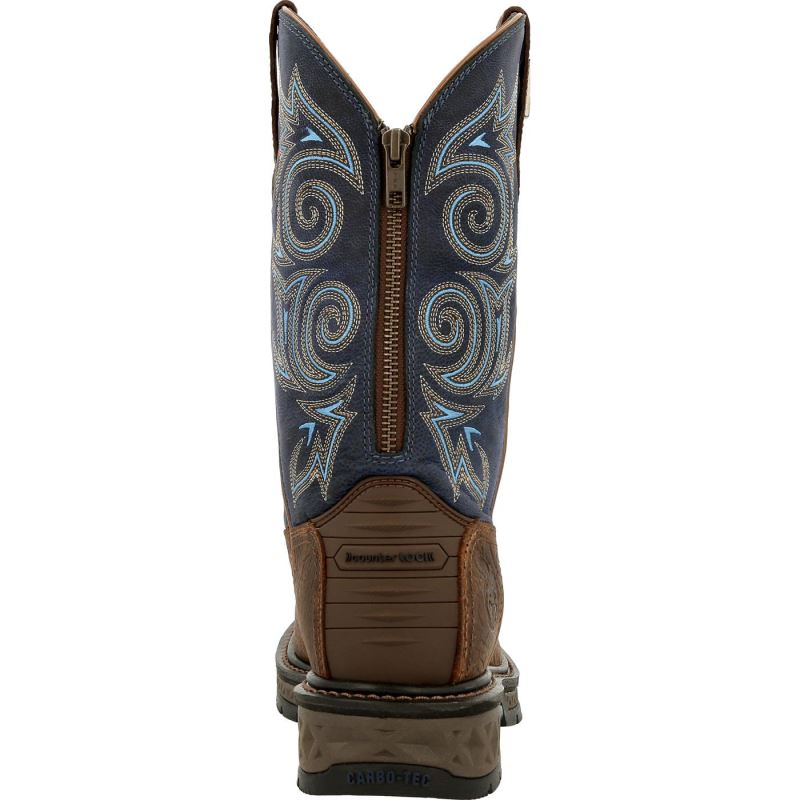 One tough sole and loads of comfort! This Carbo-Tec LT waterproof pull on boot features a faux alligator upper with a blue leather shaft and a western stitch pattern. Leather pull loops and a rear zipper aid in an easy on of the work boot. The Counter Lock System acts as both a heel stabilizer and a protectant when using your heel to remove your boot.