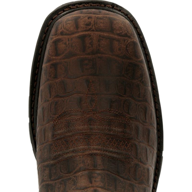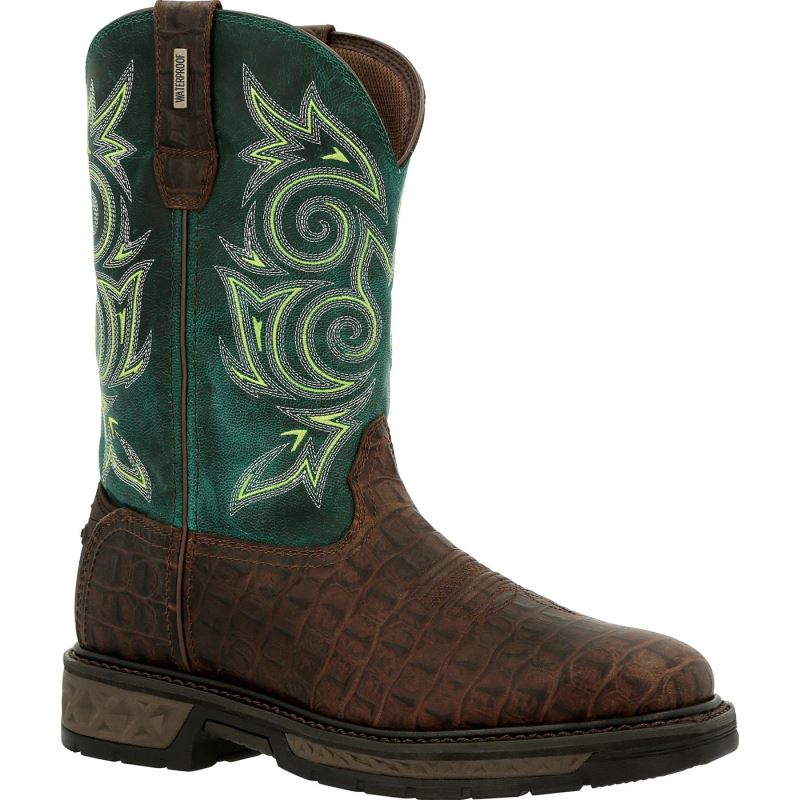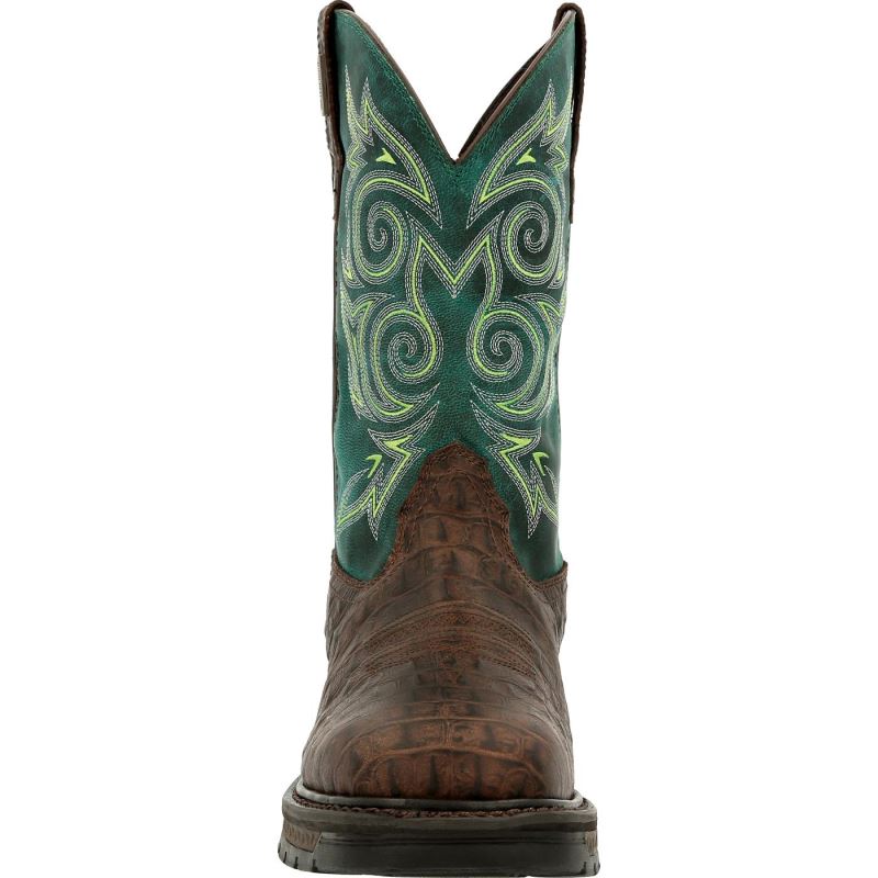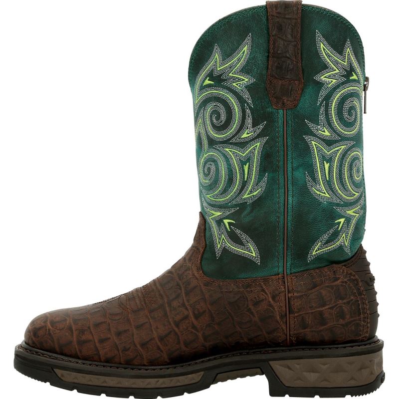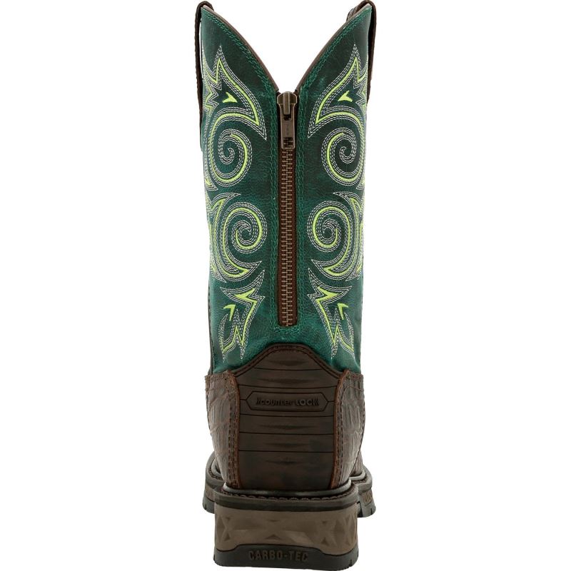 The full-grain leather upper features a green shaft with a western fancy stitch pattern and a toe bug. Leather pull straps and a rear zipper allow you to easily pull on this work boot. The dual functioning Counter Lock System prevents heel slippage and protects the back of the boot when kicking it off.