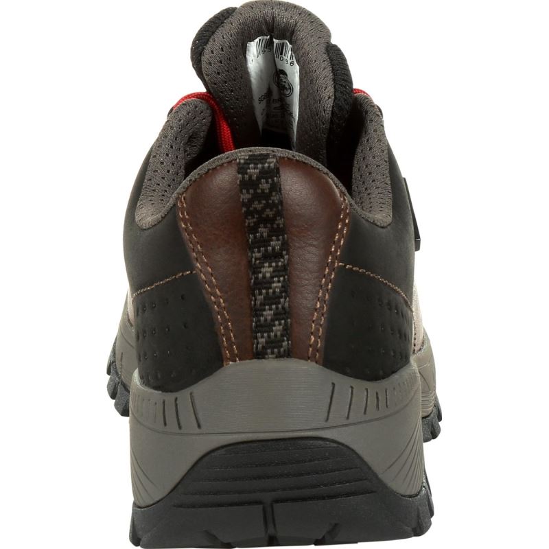 The Georgia Boot Eagle Trail waterproof oxford work shoe is lightweight and packed with comfort. The upper is made from full-grain brown and black leathers and has a padded tongue and collar for added comfort. The hardware is dual functioning with hook and eyelet options and comes with black and red laces.