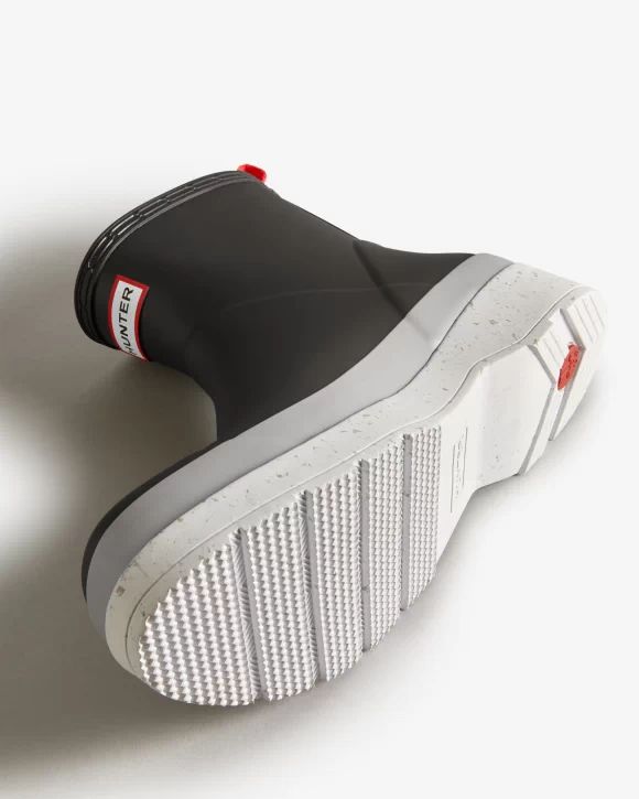 100% waterproof, the Play Short Boot offers a strong and flexible design with a flatter platform sole and angled block heel for maximum comfort. Simplifying the iconic design of the Original Boot, this black men's rain boot in a classic matte with contrast panels and a unique speckled sole, has been updated with a recycled polyester lining and insole.