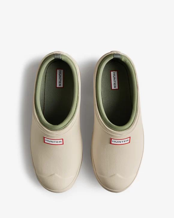 A grey slip-on shoe handcrafted from waterproof vegan rubber, designed for gardening. Updated with the iconic red box logo and recycled insole, the clog has a flexible natural rubber form and Hunter's signature tread providing grip. Lined in neoprene for breathability and comfort, it protects from the elements as well as supporting the foot.