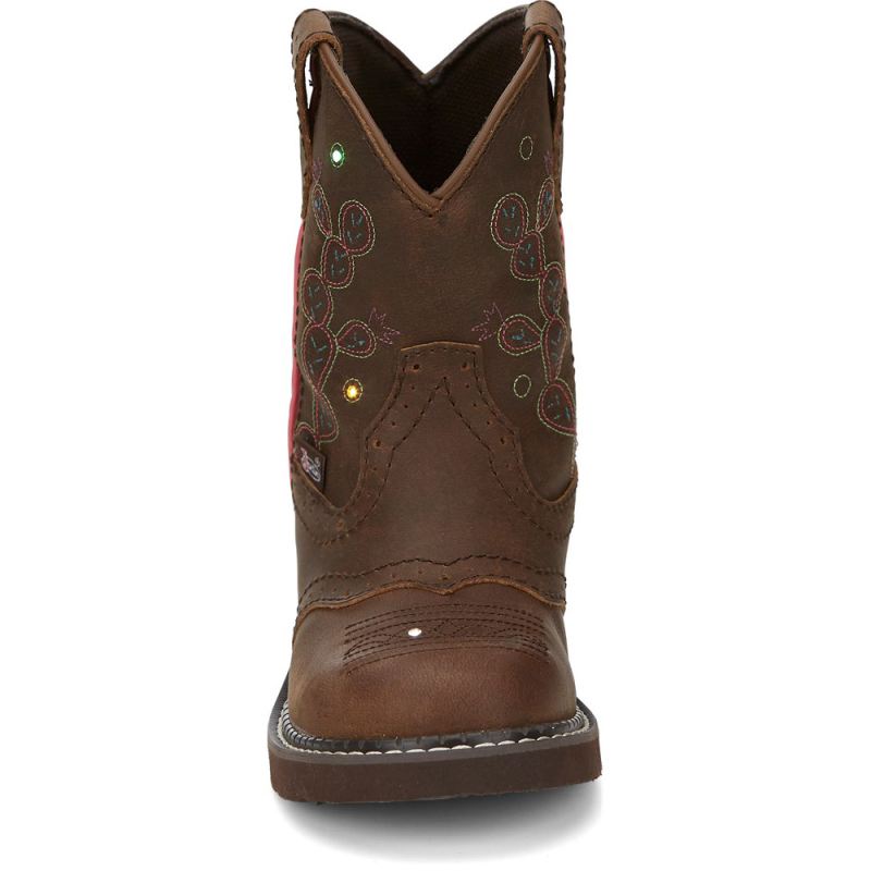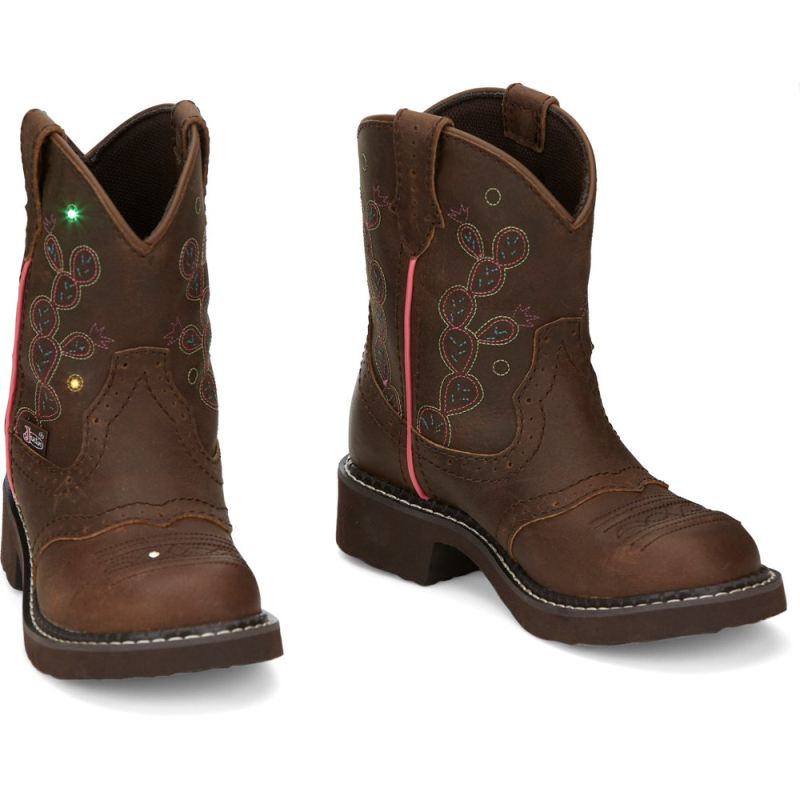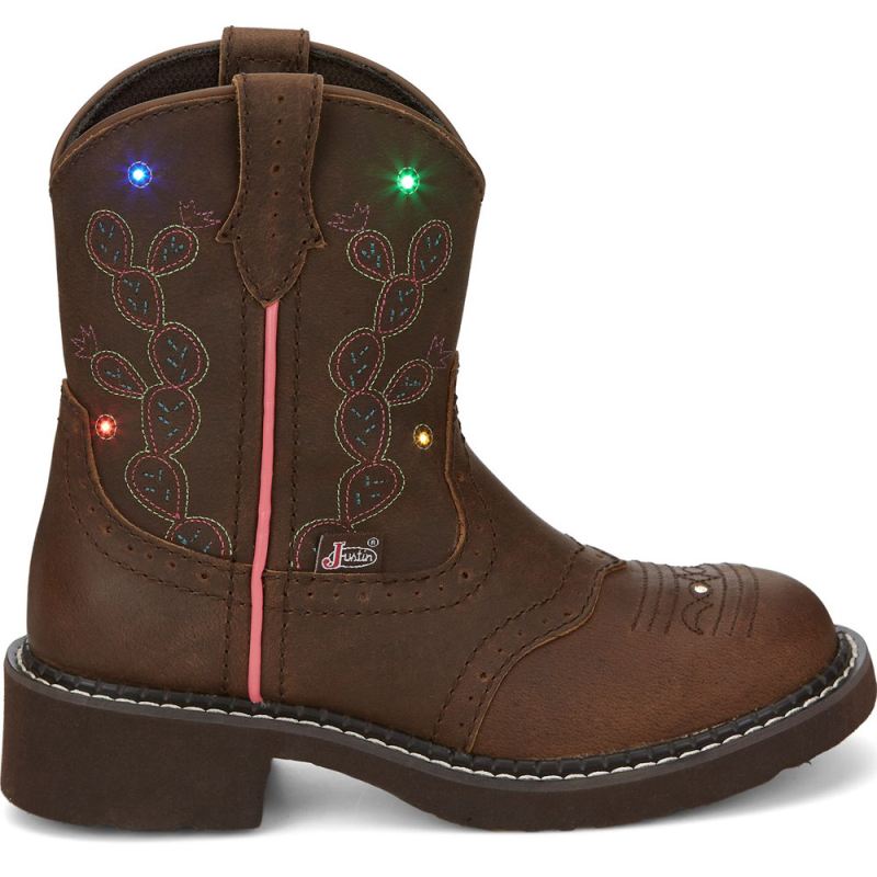 Our Glitzy boot in Brown features a leather upper with cute cactus embroidery, plus light sensors designed to illuminate with her every step, stomp and jump. The Room 2 Grow removable orthotic insole inside can be removed as your child's foot grows, adding an extra half size to the boot, and a rubber sole will give her the flexibility and traction she needs.