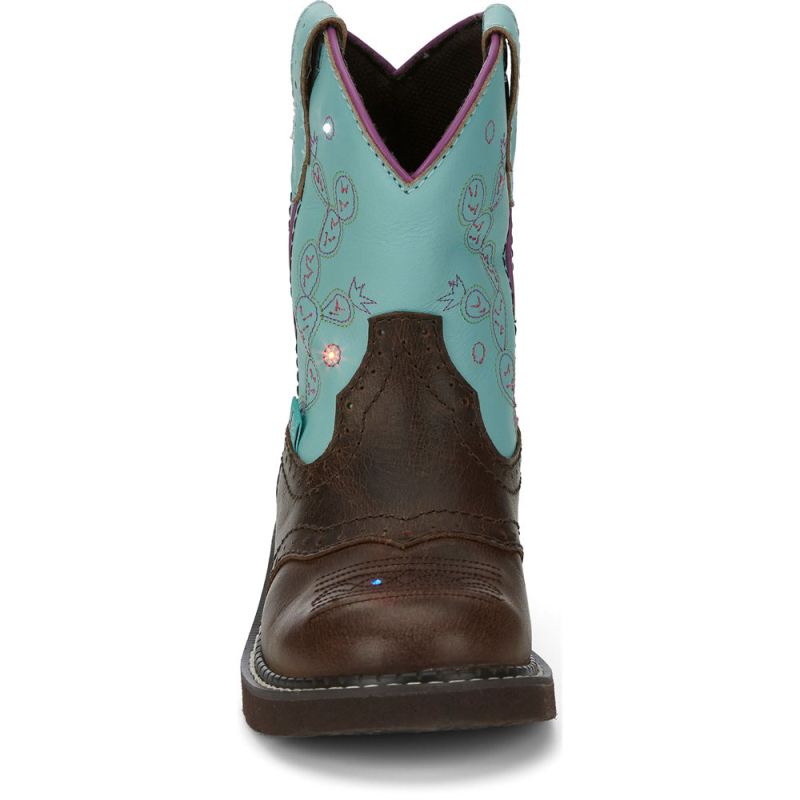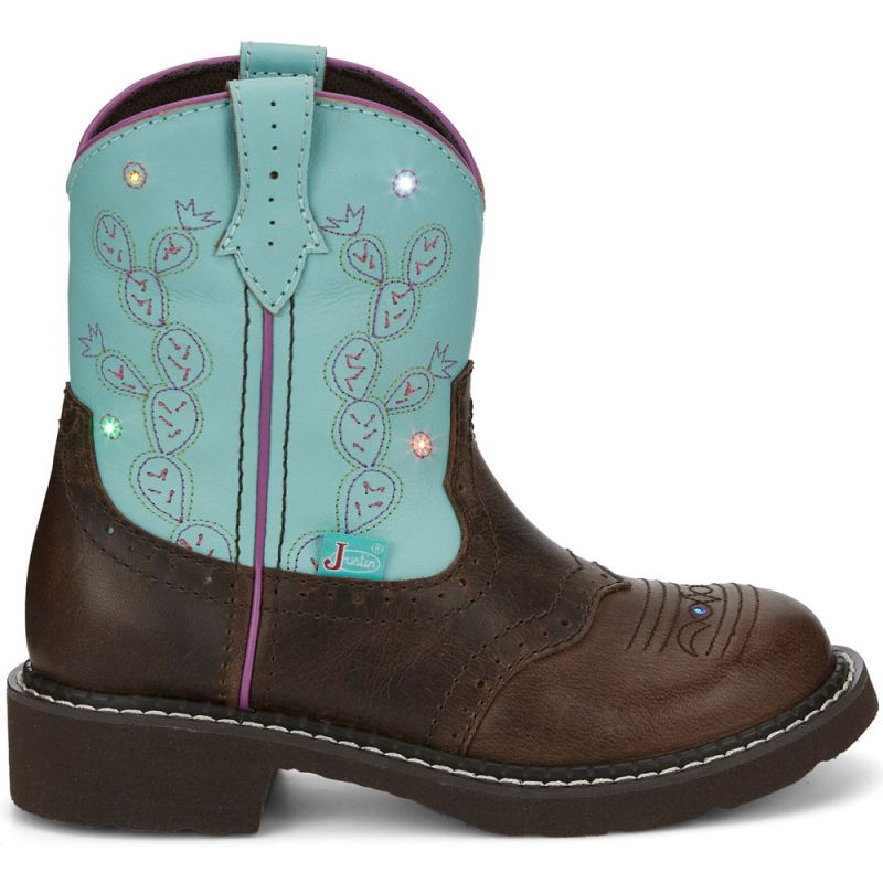 Our Glitzy boot in Brown leather features a turquoise upper with cute cactus embroidery, with light sensors designed to illuminate with her every step, stomp and jump. The Room 2 Grow removable orthotic insole inside can be removed as your child's foot grows, adding an extra half size to the boot, and a rubber sole will give her the flexibility and traction she needs.