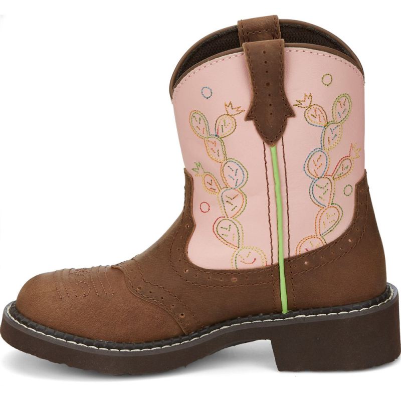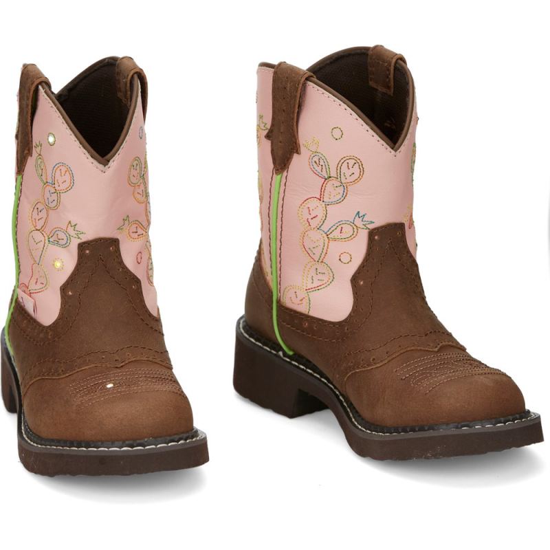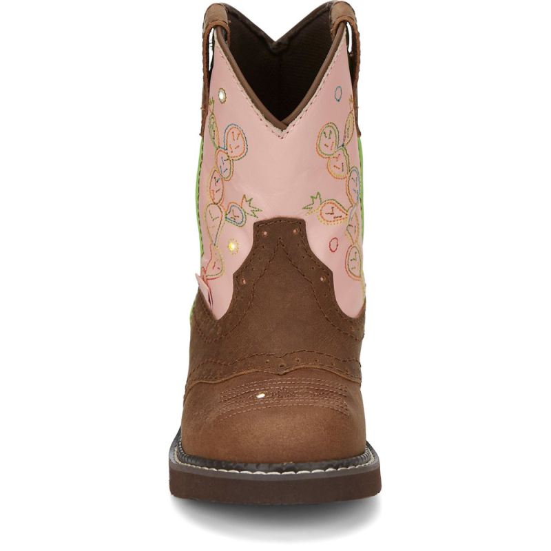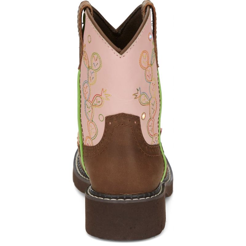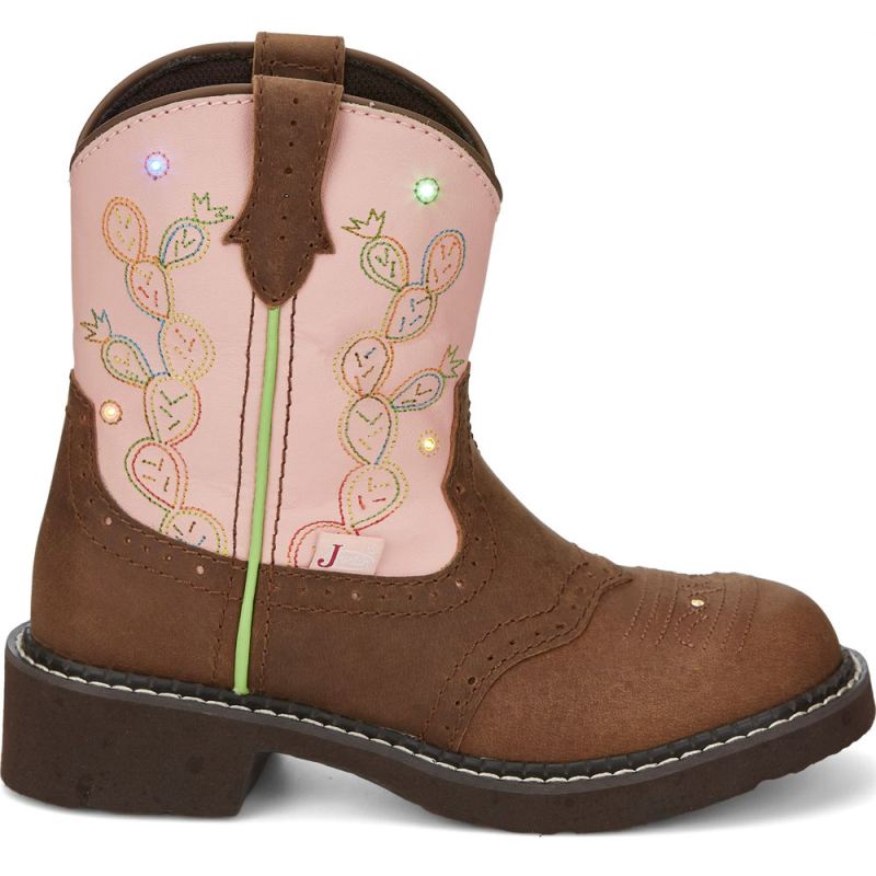 Our Glitzy boot in Tan leather features a pink upper with cute cactus embroidery, with light sensors designed to illuminate with her every step, stomp and jump. The Room 2 Grow removable orthotic insole inside can be removed as your child's foot grows, adding an extra half size to the boot, and a rubber sole will give her the flexibility and traction she needs.