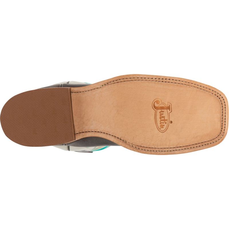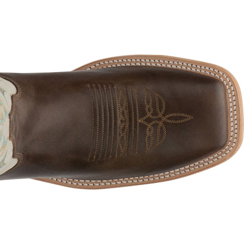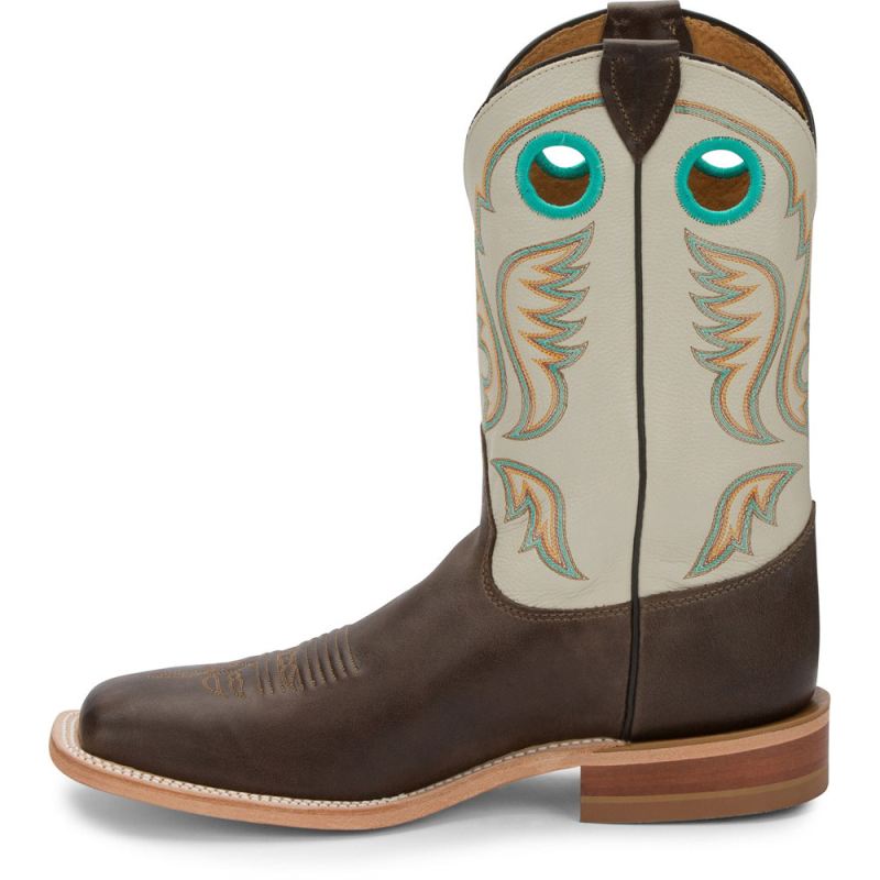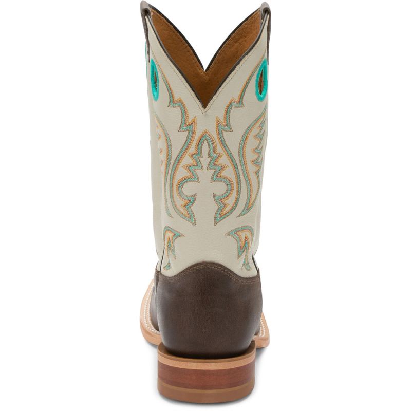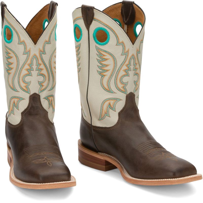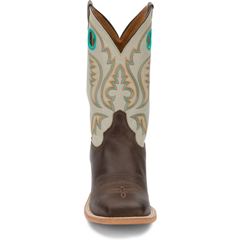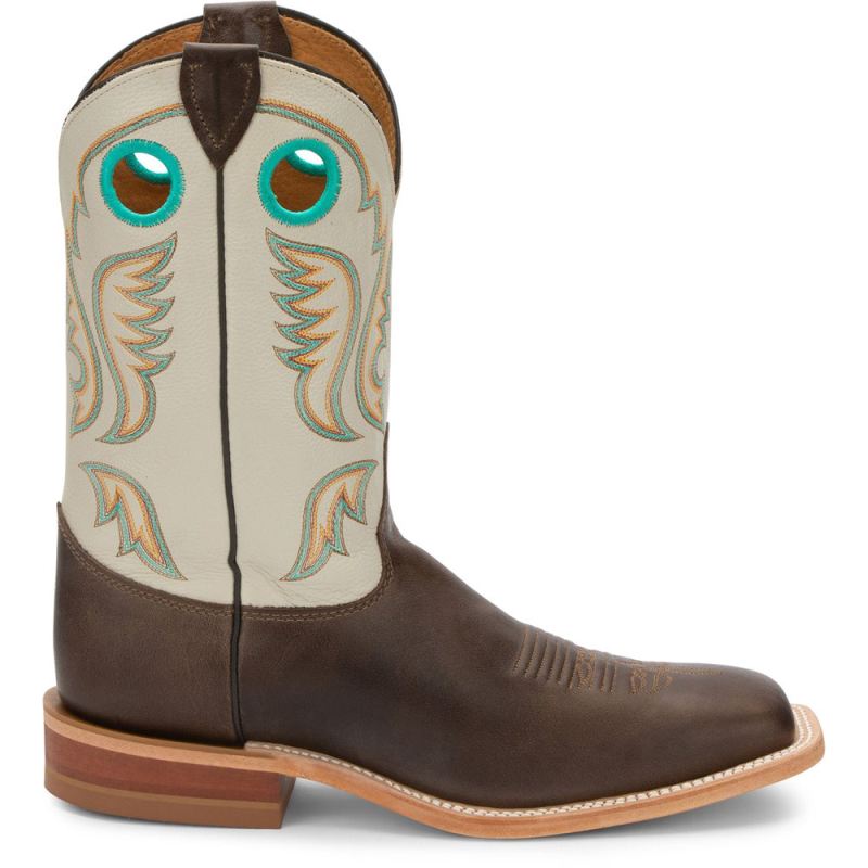 Its ivory cowhide upper is a bright contrast to the colorful stitch pattern and polished brown leather foot. It has classic elements such as the broad square toe and low heel that provide a relaxed fit and the J-Flex Flexible Comfort System" insoles add functionality and durability to such a charismatic boot.