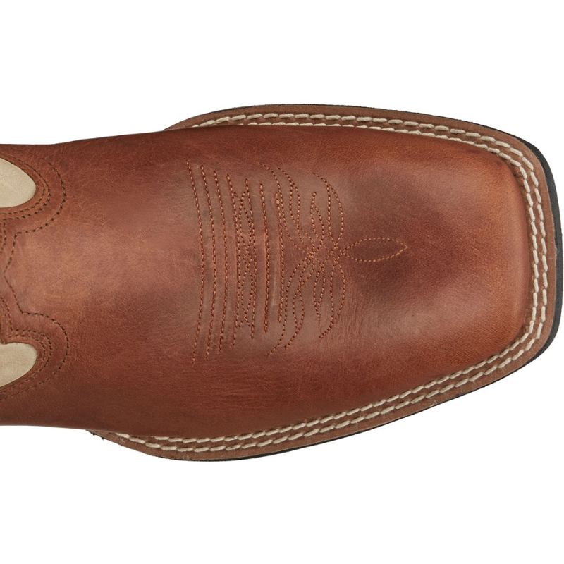 This 11" wide square toe western boot brings you a larger platform and bold new design featuring a two-tone look with top-notch stitching on tan cowhide with a contrasting brown cowhide foot and pull straps. With upgraded leather and a breathable lining, a removable orthotic comfort insole and an oil- and-slip resisting outsole, the Canter gives you premium quality and performance at an excellent value.