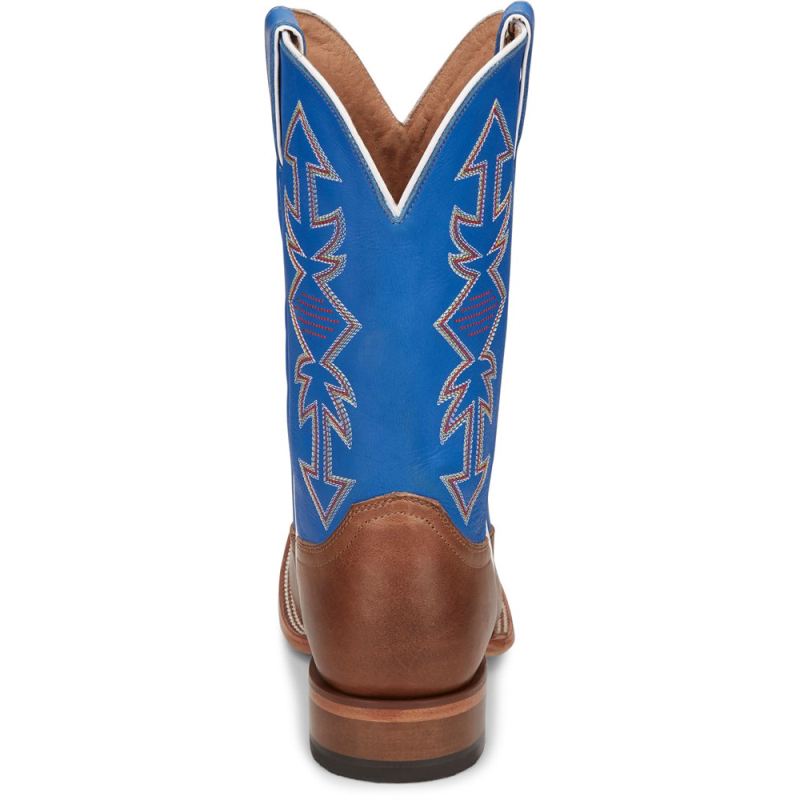 A unique top stitch pattern of sharp angles adorns the striking jewel blue cowhide upper. The Buckskin Tan cowhide complements it for a look that commands attention. This vintage-inspired boot is both functional and comfortable. It features a block heel, a wide square toe, and the J-Flex" Comfort System. Our Punchy collection is crafted of durable leathers that are as tough as the men who put them to the test every day.