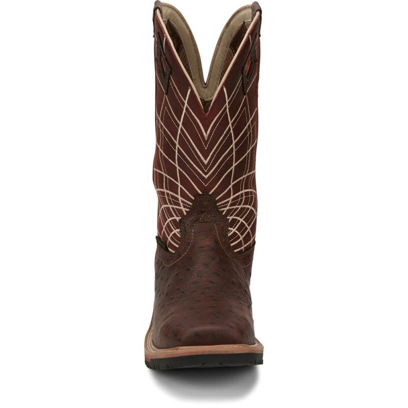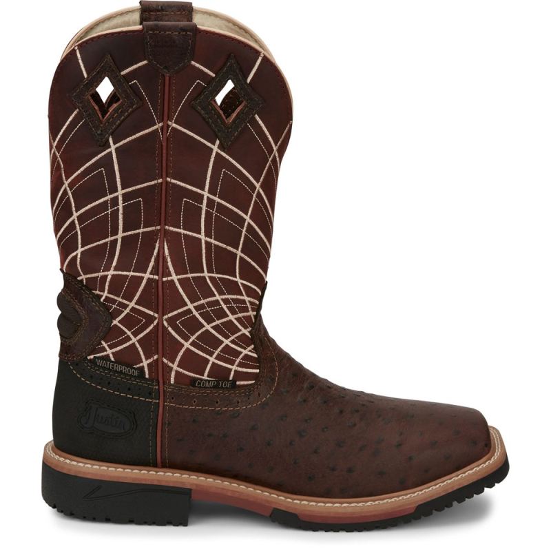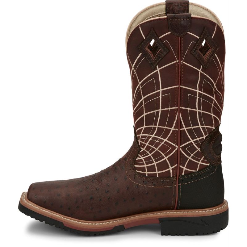 A bold radiating web pattern accents the Burgundy shaft, and the Rust Ostrich Print toe adds exotic appeal. inside, This boot features layers of comfort with a J-Flex Flexible Comfort System" insole, the Justin Stabilization Technology", Ortholite" Comfort Foam insole, and a Dri-Lex" cover. The composite toe provides security and comfort and meets safety standards without weighing you down. Its multi-density rubber and EVA combination outsole offers lightweight durability. This boot also provides an Achilles Relief System" that eliminates weak spots in foot comfort by using stretchable material, high-density foam, and moisture-wicking anti-microbial lining to provide flexibility, support and breathabilitythe Hybred" Orthotic insole provides all-day comfort. This boot is equipped with a composite toe for protection and a durable Hybred"outsole that meets ASTM F2413-11 I75 C75 EH safety footwear standards.