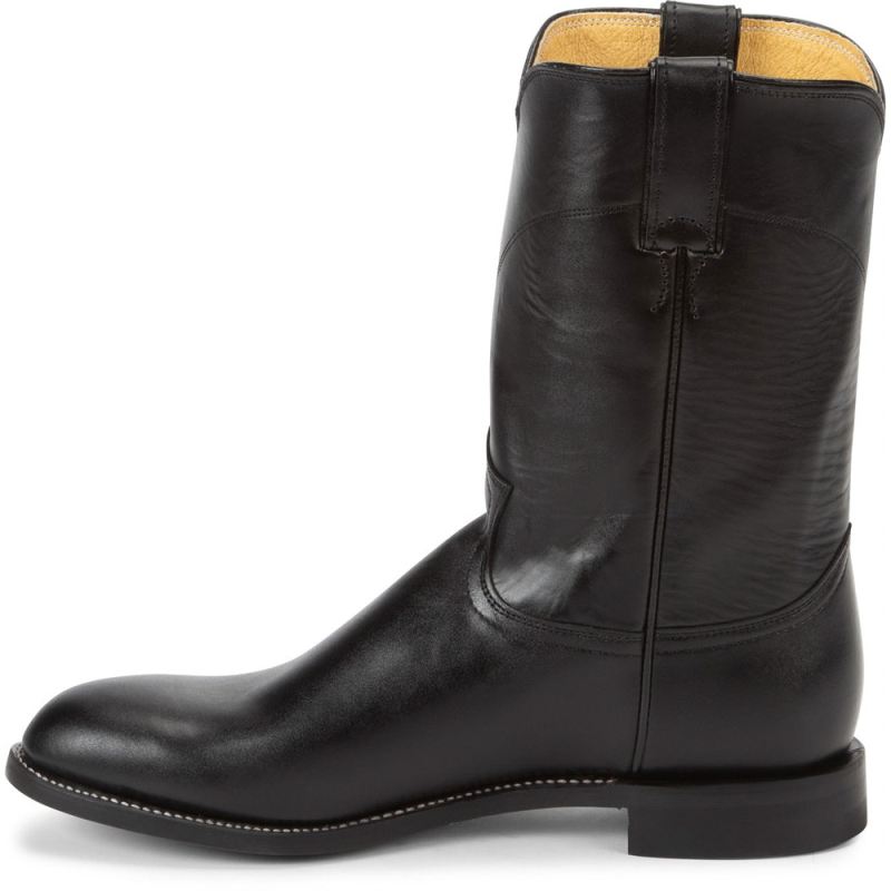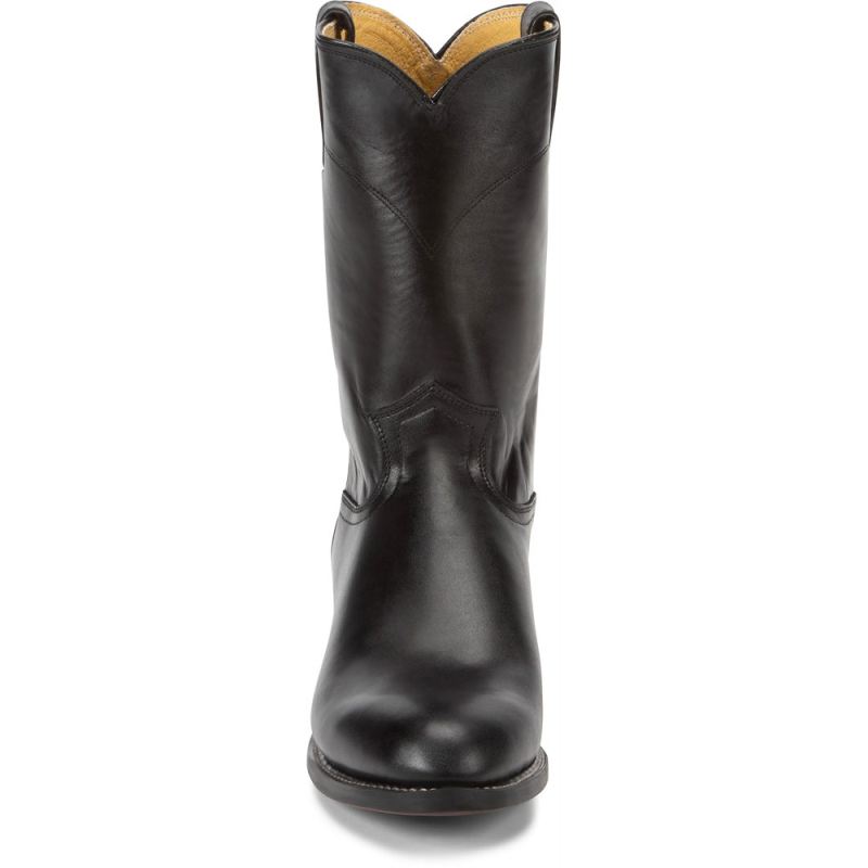 An understated classic, the Jackson Black 10" tall Men's roper boot is a simple black boot with a traditional silhouette. The quality leather exterior glistens with the sheen of luxury and its round toe and unit heel provide a relaxed fit in and out of the stirrup. The J-Flex Flexible Comfort System" insoles keep things comfortable with leather-covered cushioned insole and triple density insole board.