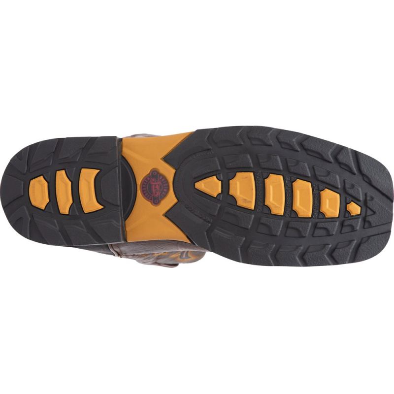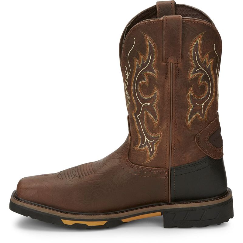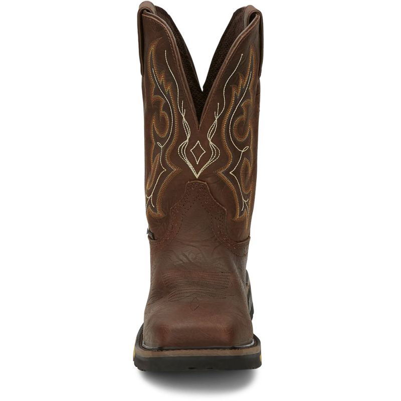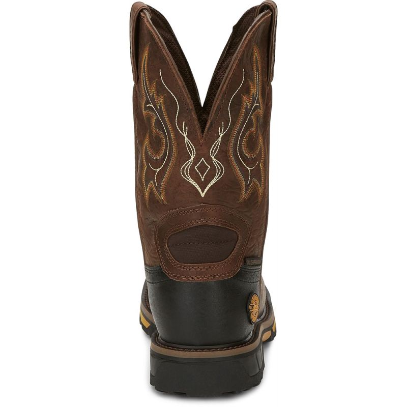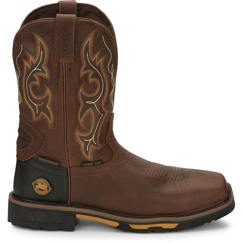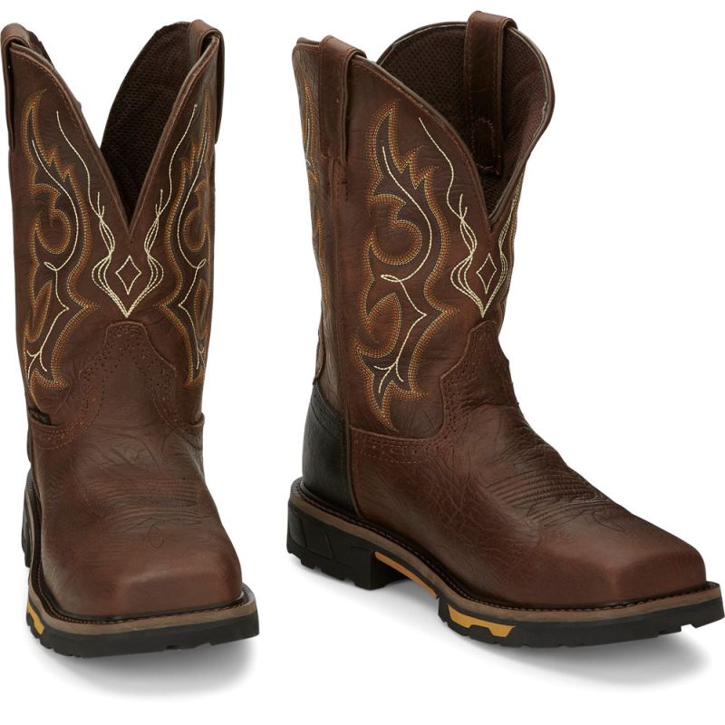The rustic brown leather exterior is waterproof and accented by a simple stitch pattern along the upper. This boot features layers of comfort with a J-Flex Flexible Comfort System" insole, the Justin Stabilization Technology", Ortholite" Comfort Foam insole, and a Dri-Lex" cover. The composite toe provides security and comfort and meets safety standards without weighing you down. Its multi-density rubber and EVA combination outsole offers lightweight durability and meets the standards for electrical hazard footwear so you are guaranteed protection against open circuits of up to 18,000 volts. This boot also provides an Achilles Relief System" that eliminates weak spots in foot comfort by using stretchable material, high-density foam, and moisture-wicking anti-microbial lining to provide flexibility, support and breathability.