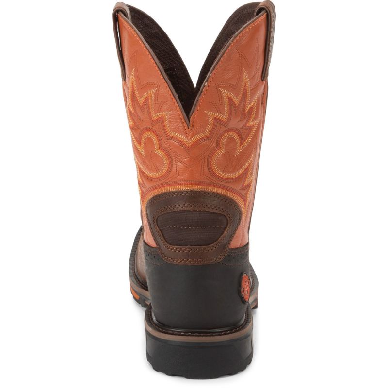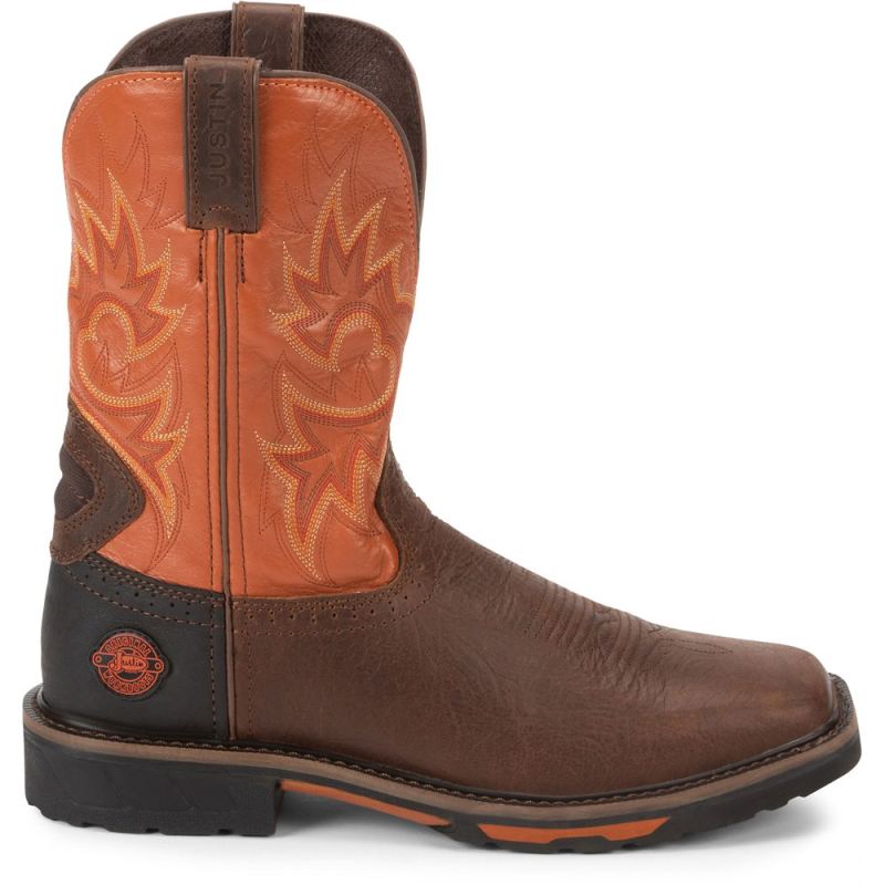 It sports a bold and rustic orange leather upper and a colorful orange and yellow stitch pattern giving this boot some personality. It brings quality and comfort to the job with a J-Flex Flexible Comfort System" insole, the Justin Stabilization Technology", Ortholite" Comfort Foam insole, and a Dri-Lex" cover. Its multi-density rubber and EVA combination outsole offers lightweight durability and meets the standards for electrical hazard footwear so you are guaranteed protection against open circuits of up to 18,000 volts. This boot also provides an Achilles Relief System" that eliminates weak spots in foot comfort by using stretchable material, high-density foam, and moisture-wicking anti-microbial lining to provide flexibility, support and breathability.