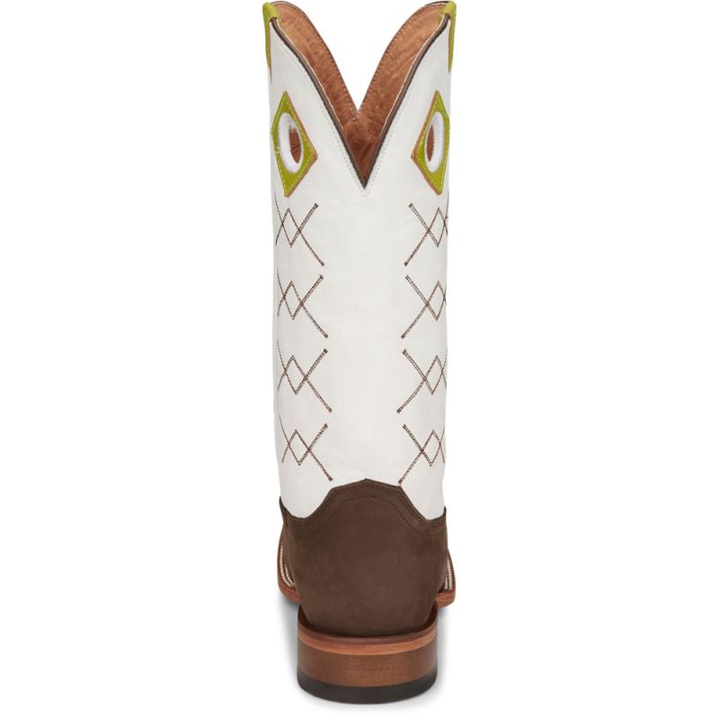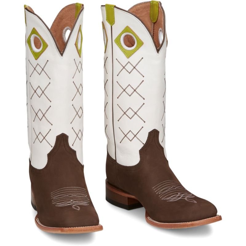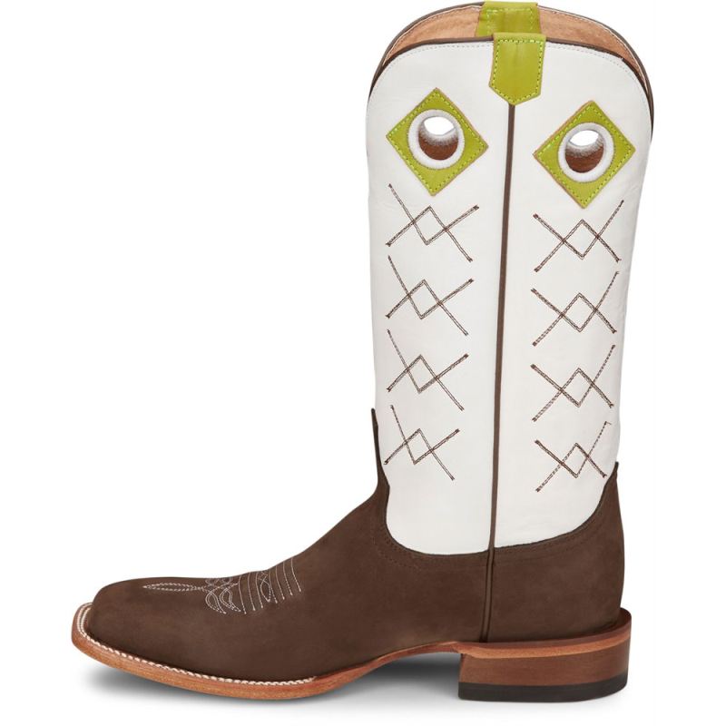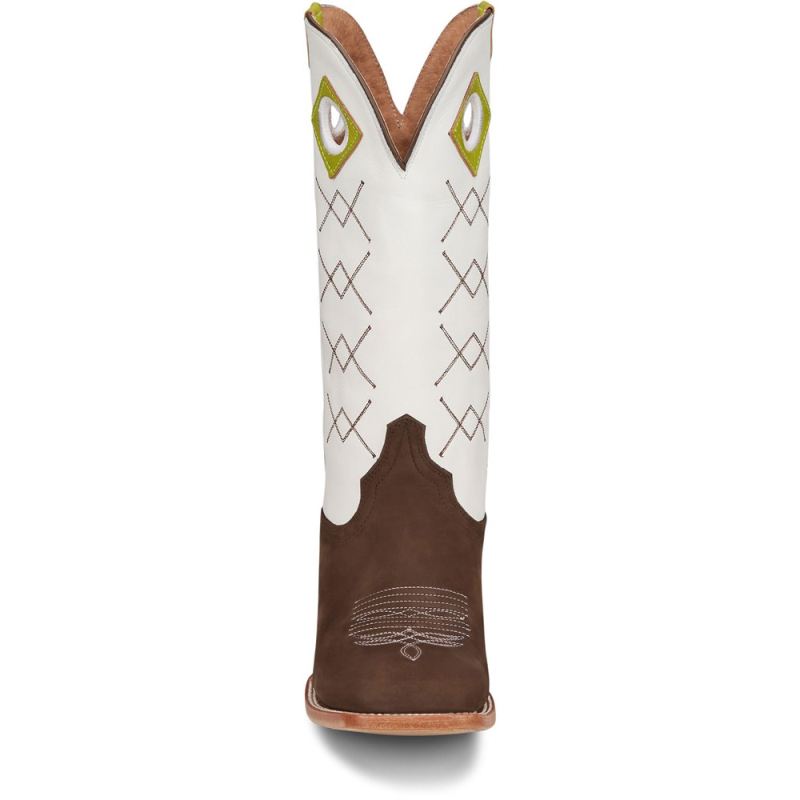 These boots are as refreshing and smooth as a tequila blanco with a twist of lime after a long day of work. A smooth, bold upper in blanco cowhide accented with lime pull holes and straps contrasts our traditional strong Dark Brown cowhide vamp to make a boot that goes on smooth and is strong enough to tackle the day. This vintage-inspired boot is both functional and comfortable and features a block heel, a wide square toe, and the J-Flex Comfort System". Our Punchy collection is crafted of durable leathers that are as tough as the men who put them to the test every day.Like other natural products, leather offers unique textures and appearances which means no two pieces are the same. It is not unusual to see varying grain differences and characteristics from one boot to the next.