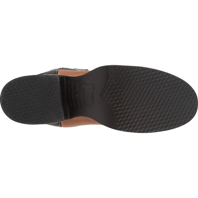 The midnight black leather upper features a gold stitching along the upper and black leather panel on the heel. The golden brown foot has a round toe and double stitch welt that allow for maximum durability and the J-Flex Flexible Comfort System" insole cushions and supports the foot guaranteeing lasting comfort. The rubber outsole resists oil &" abrasions and provides a relaxed fit in and out of the saddle. This style is proudly Made in the USA with global parts.