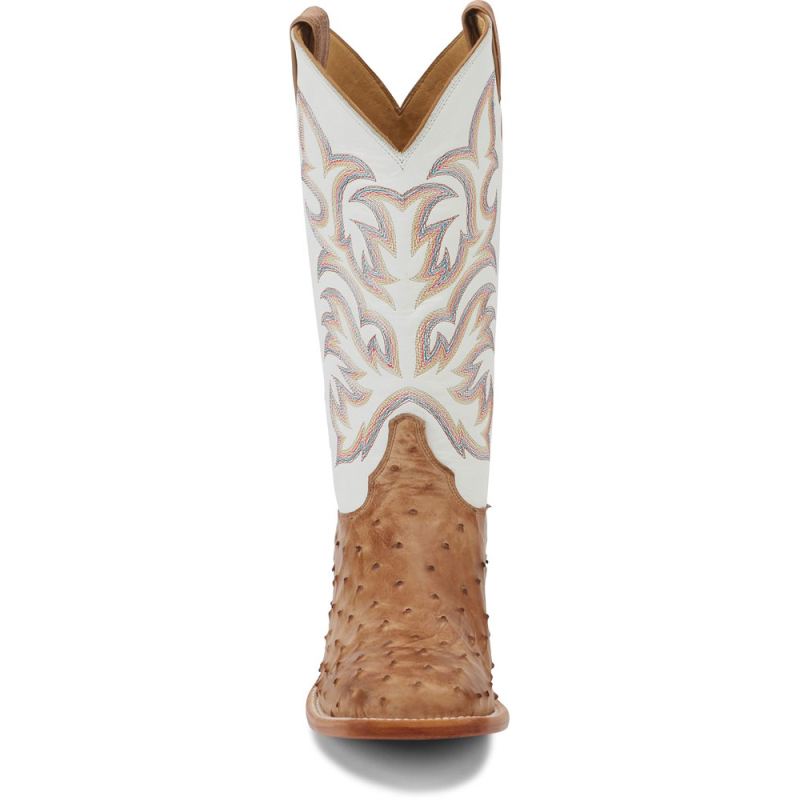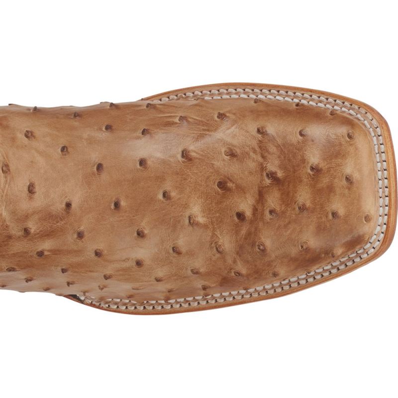 The golden tan full quill ostrich foot with matching pull straps is slightly distressed giving this boot a vintage feel. The square toe and long base heel provide a relaxed fit in the stirrup and the J-Flex Flexible Comfort System" insoles support and cushion the foot for lasting comfort.