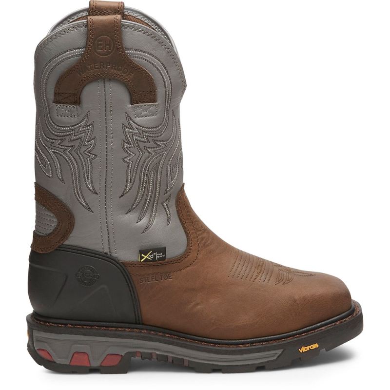 The gun metal gray shaft and brown steel not only has style" it provides added protection of your metatarsals with a flexible and light weight XRD" Impact Protection Metguard that overlays the safety toe. For comfort and endurance, this waterproof boot features an Ortholite" insole and the Vibram" Commander-X5 rubber outsole that is resistant to heat, oil, chipping, chemicals, and slipping. This boot is electrical hazard rated and meets ASTM F2413-11, 175, C75 EH MT safety footwear standards.