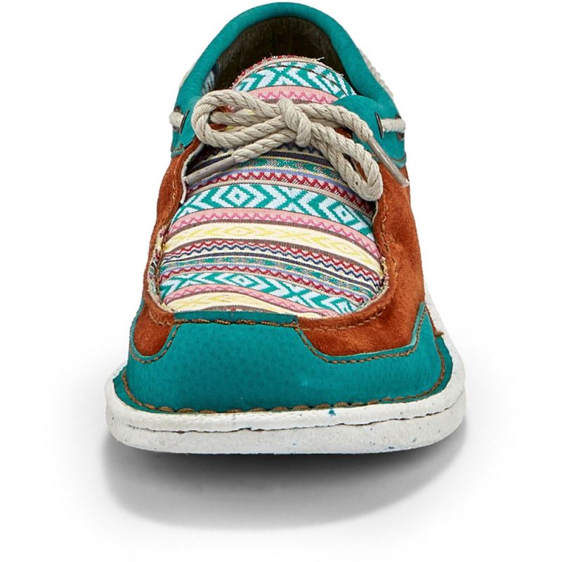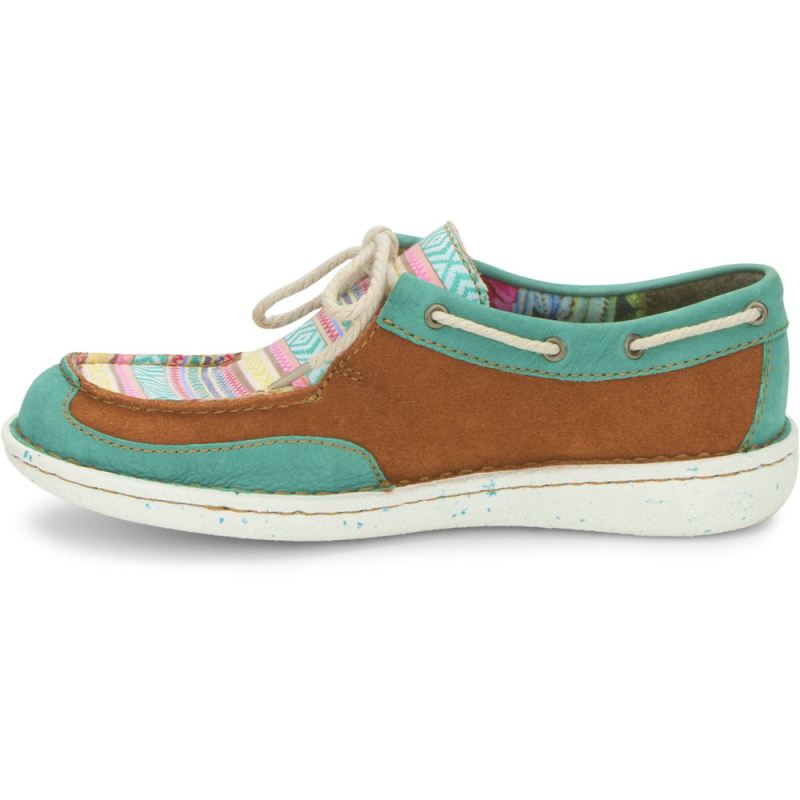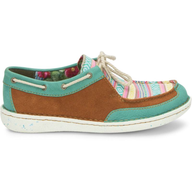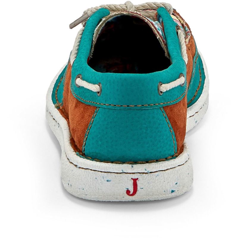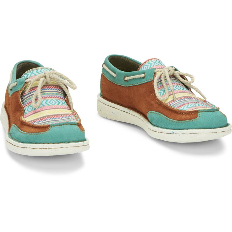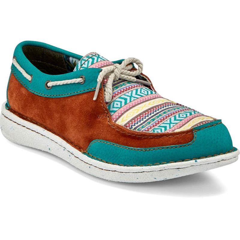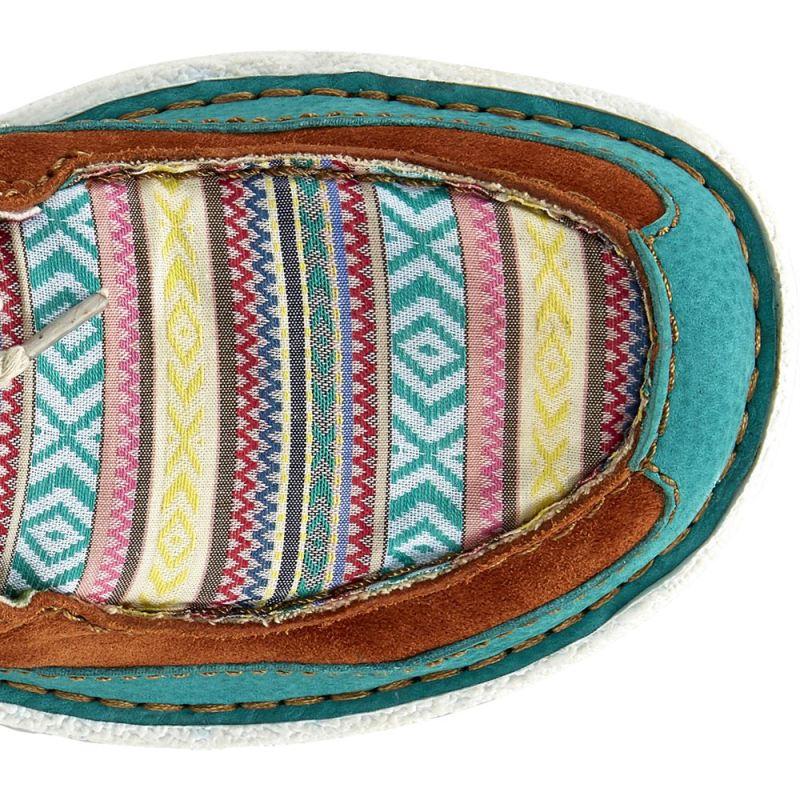 Sunny, bright hues in a vibrant Southwestern-inspired pattern bring a colorful twist to the lightweight, ultra-comfortable Boatie slip on in Turquoise from the Justin Casuals Collection.