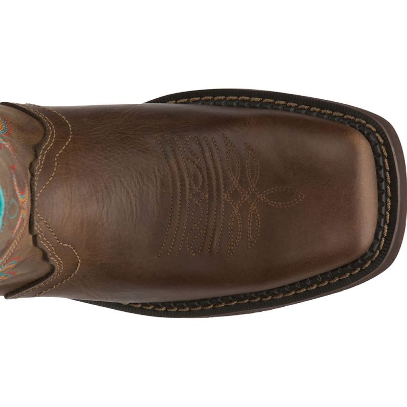 Its distressed golden tan leather exterior features a vibrant and feminine stitch pattern on the upper with a teal seam on each quarter and around the collar giving this boot a vintage feel. It's built for comfort with a square toe and unit heel and the J-Flex Flexible Comfort System" insole with removable orthotic inserts add cushion and support in or out of the saddle.