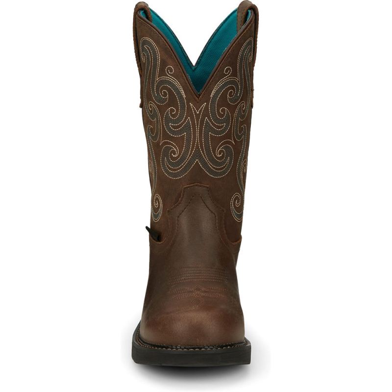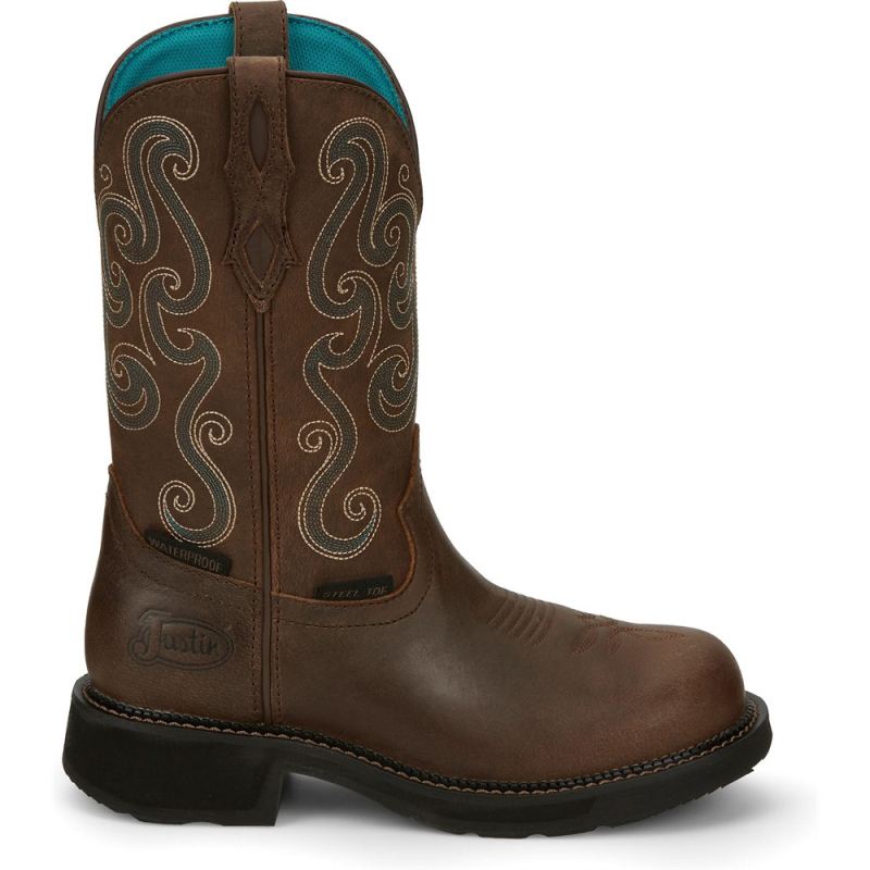 The Tasha Steel Toe women's Justin Gypsy workboot steps on the wild side with chocolate chip brown leather and a turquoise and cream stitching on the shaft.