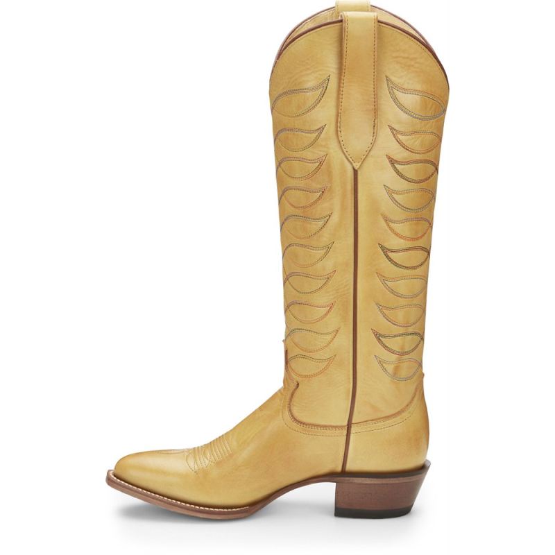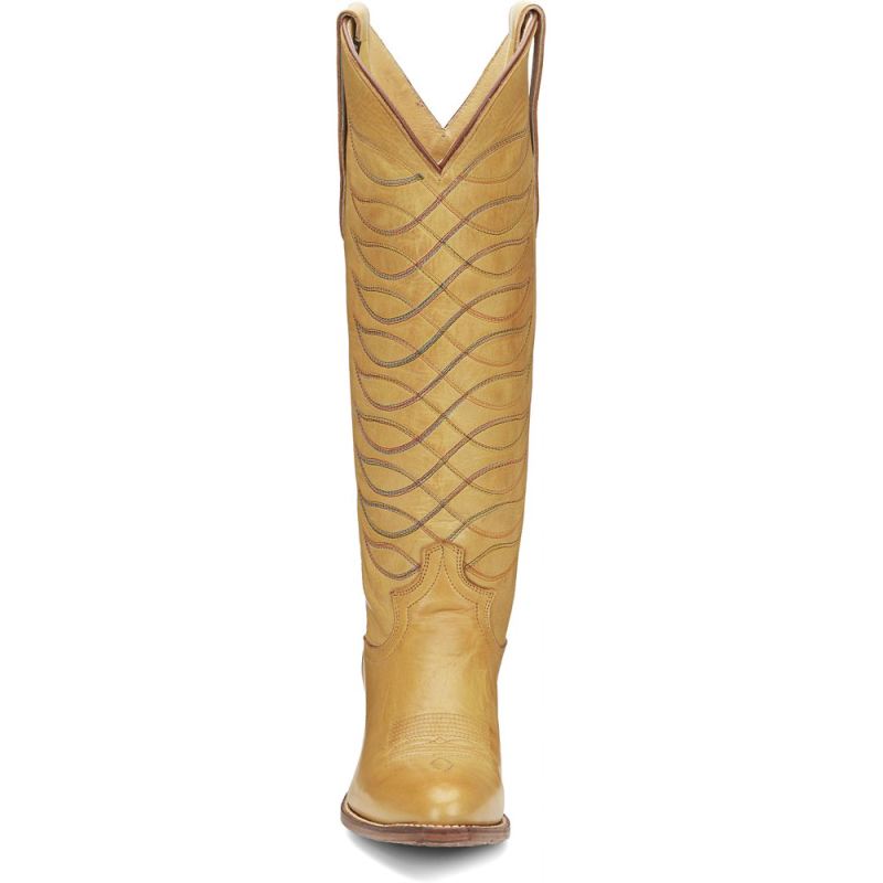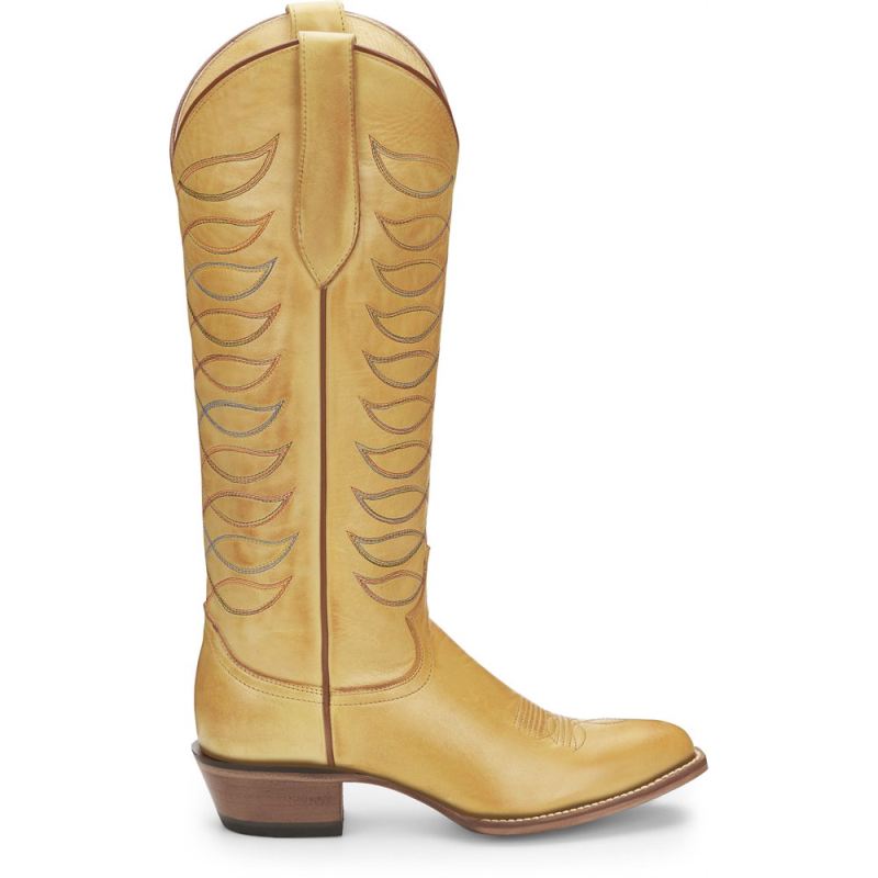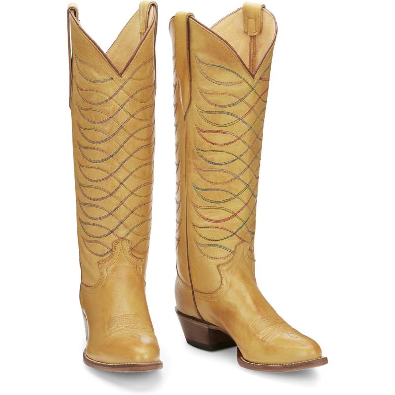 Inspired by some of our favorite 1970s and 80s styles from the Justin archives, the gorgeous Whitley boot from our Vintage collection features beautiful golden yellow leather embroidered with vibrant multi-color threads on a striking 15" silhouette. It's designed with a medium round toe, a cowgirl underslung heel and features our J-Flex Comfort System" insole for feel-good comfort and support.This striking throwback style celebrates our rich bootmaking heritage and will make a wonderful foundation for any look.