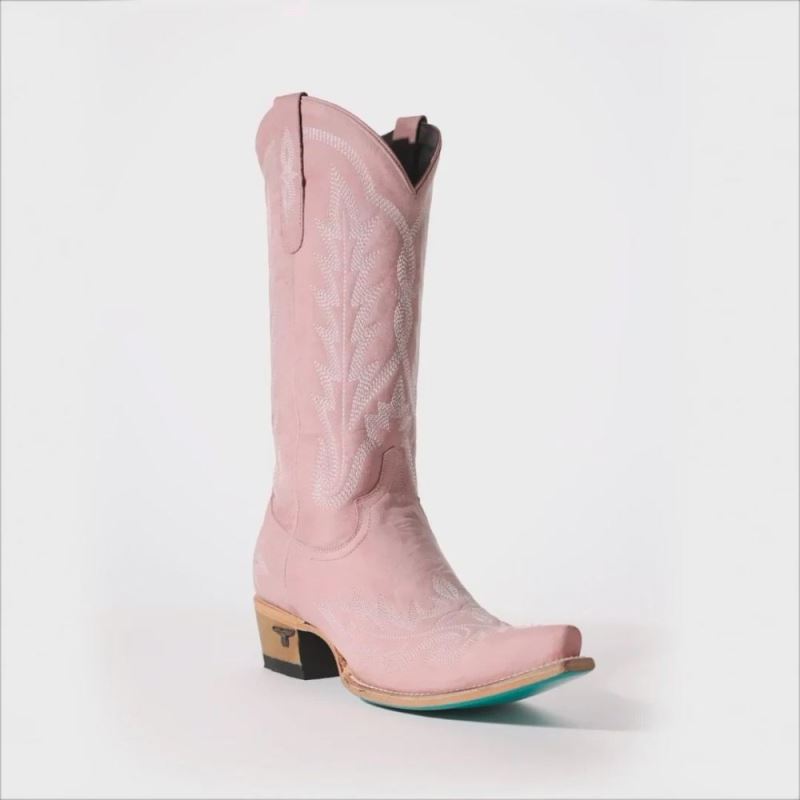 She's the perfect blush cowgirl boot. Heirloom quality with a western vibe. The classic snip toe profile is embroidered to perfection with a twist on traditional flame stitch. Her Blush finish makes it a perfect fit for everyday to girl's night out.