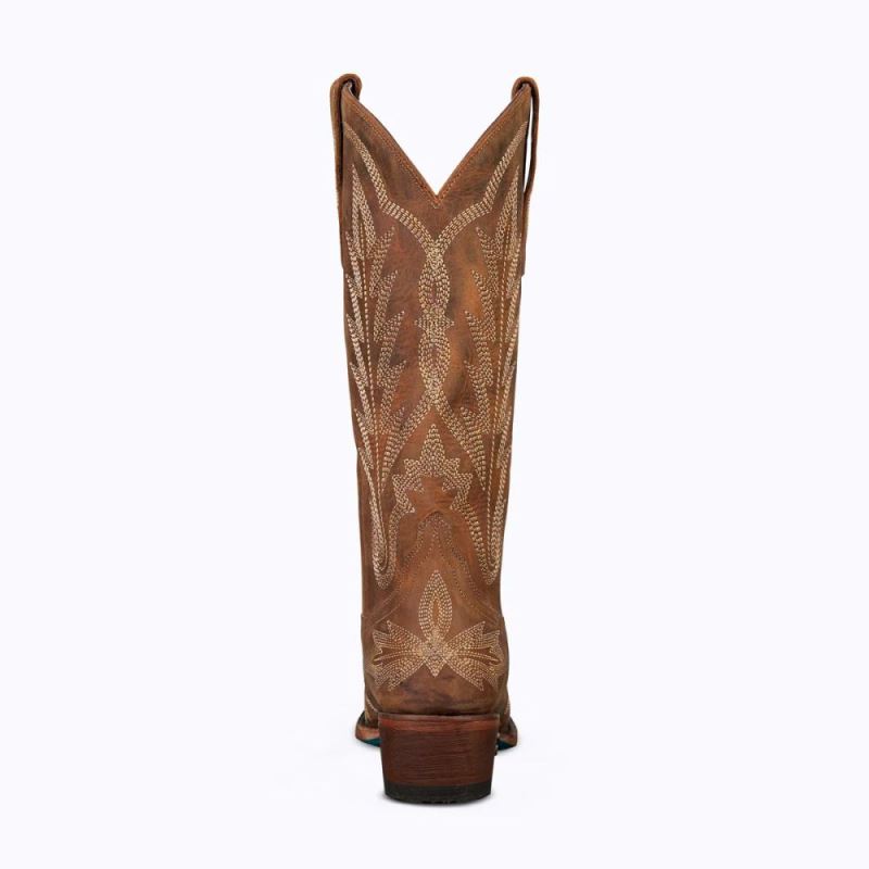 She's the perfect brown cowgirl boot. Heirloom quality with a western vibe. The classic snip toe profile is embroidered to perfection with a twist on traditional flame stitch. Burnt Caramel finish makes this a perfect fit for everyday to girl's night out.
