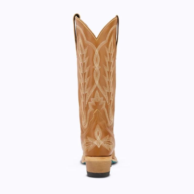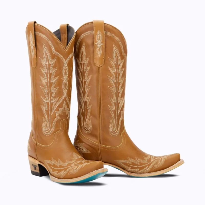 She's the perfect tan cowgirl boot. Heirloom quality with a western vibe. The classic snip toe profile is embroidered to perfection with a twist on traditional flame stitch. Her saddle finish makes it a perfect fit for everyday to girl's night out.