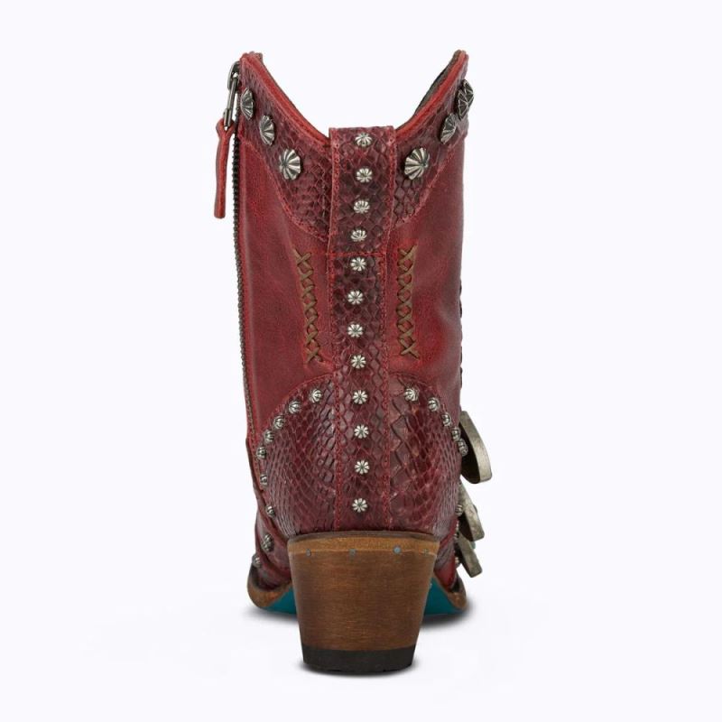 Step out boldly in variegated exotic leather, old pawn inspired hardware, and a functional corset on this ankle boot baddie. An elevated heel to accentuate your best features and bring confidence to your step.