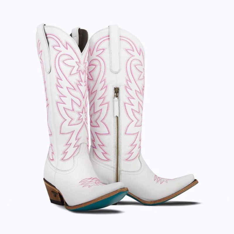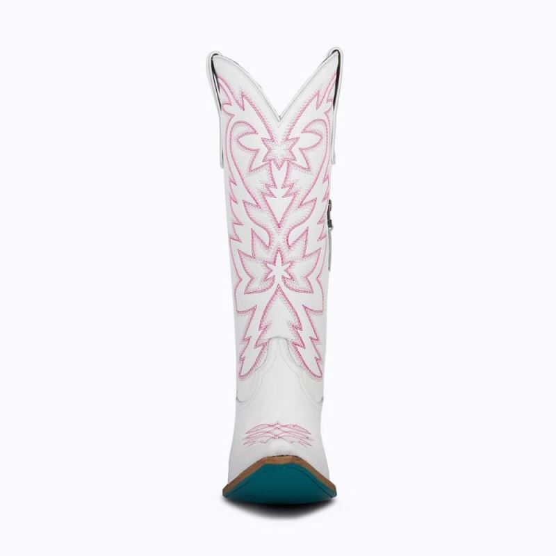 She's the perfect chic, white cowgirl boot with a pop of pink right off the runway.