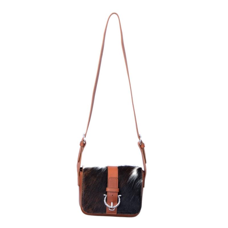 In dramatic black and white, the Mini Cowprint Bag is handmade from hair-on cowhide. Trimmed in tan leather and accented with silver hardware, it's a Western-style purse with space for the essentials. With an adjustable strap and magnetic snap, this bag is effortless Western fashion.