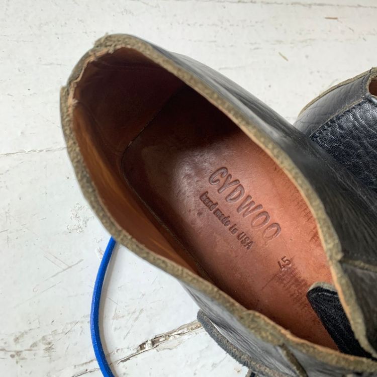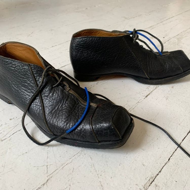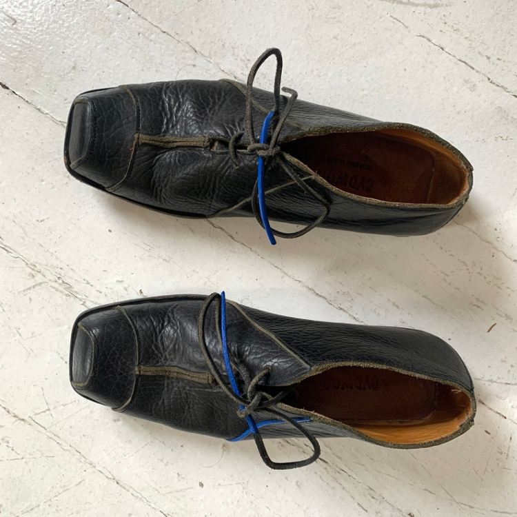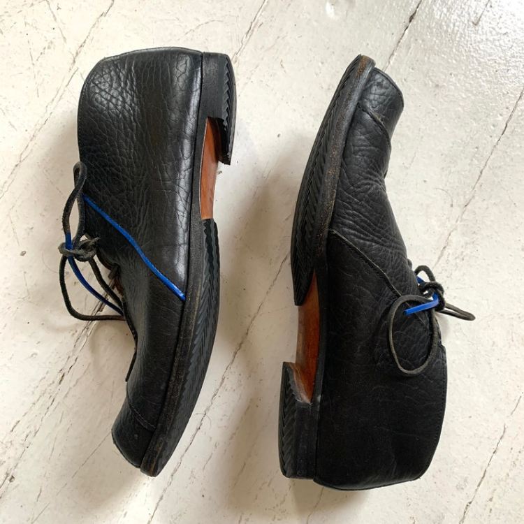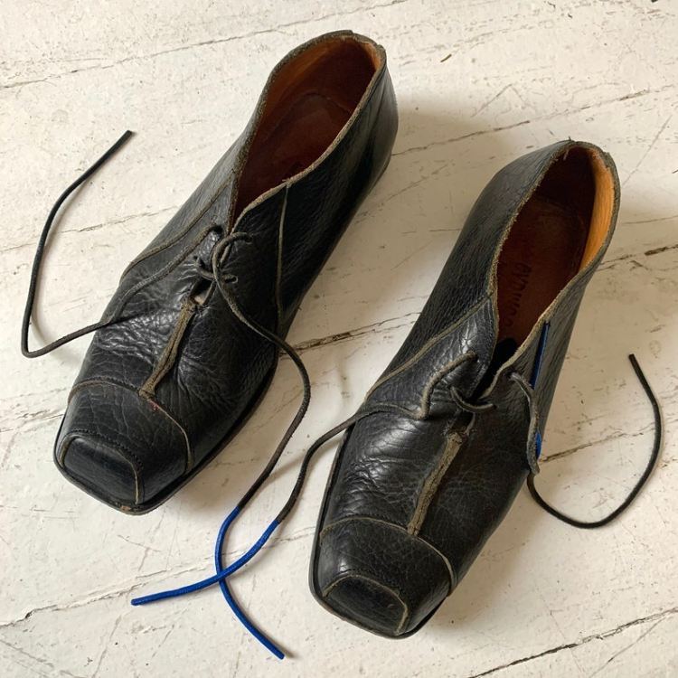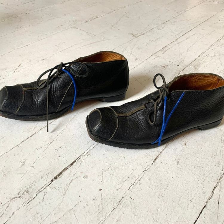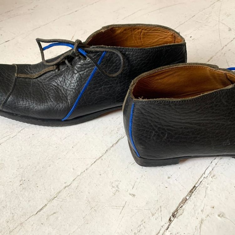Sustainable California designer shoes Cydwoq, handmade in the USA. 90s leather boot, recently hand painted with a minimalist stroke of blue on each shoe. Super cool shape, reminiscent of a ski boot. Leather laces with a one blue tip. Sole seems in brand new condition. These are rad!