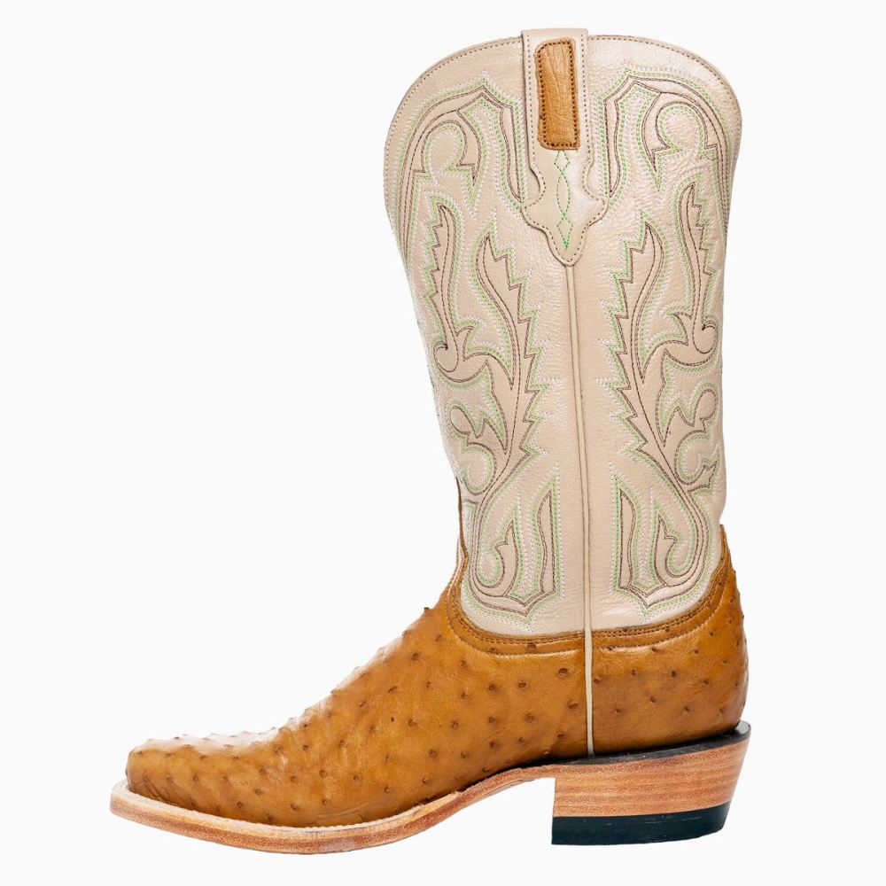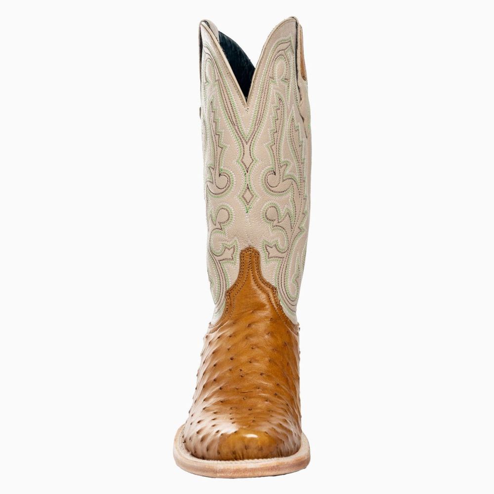 The Antique Saddle is a timeless classic cowboy boot that can be worn by all generations. All the greats in your favorite westerns would have worn this boot with its antique saddle-colored full-quill ostrich vamp and a taupe shaft. Available in a cutter toe and western heel.